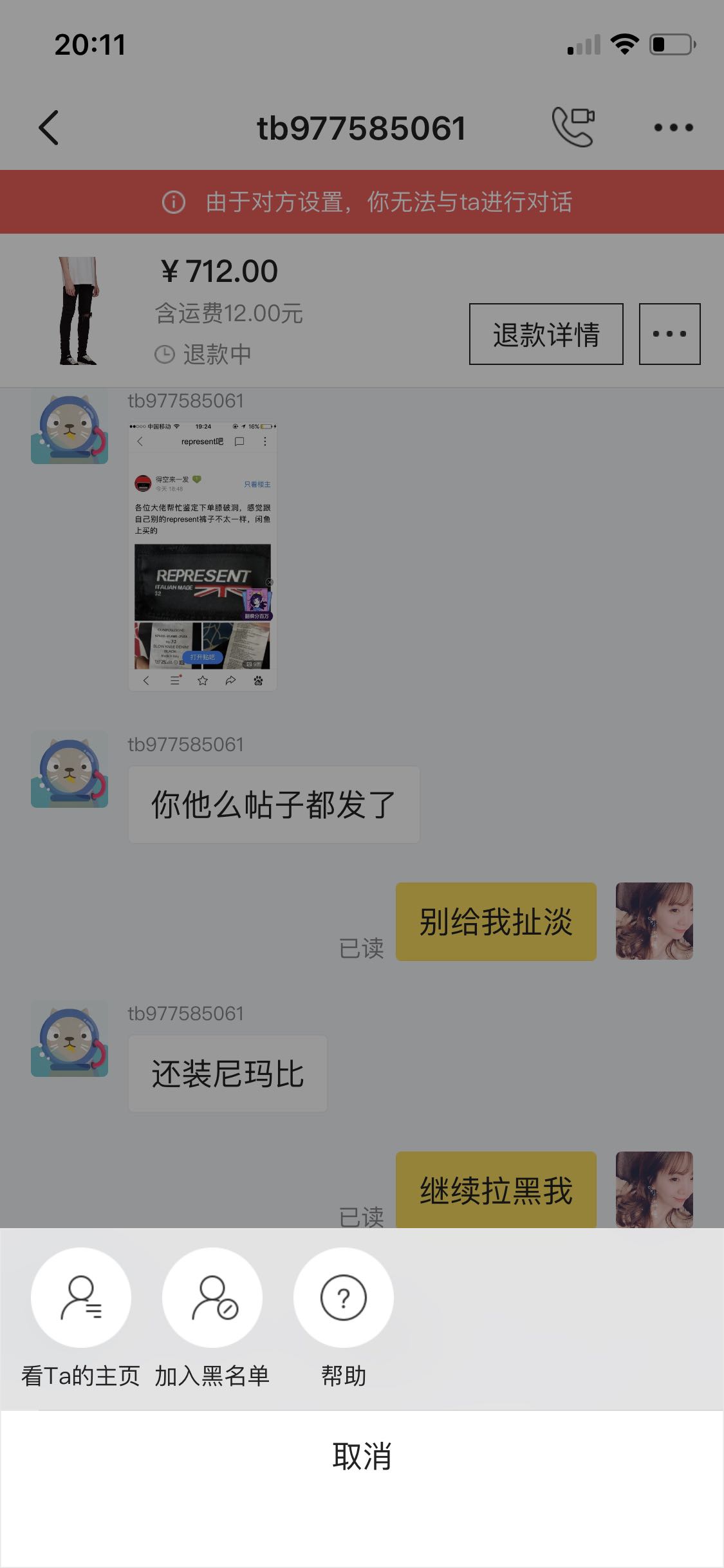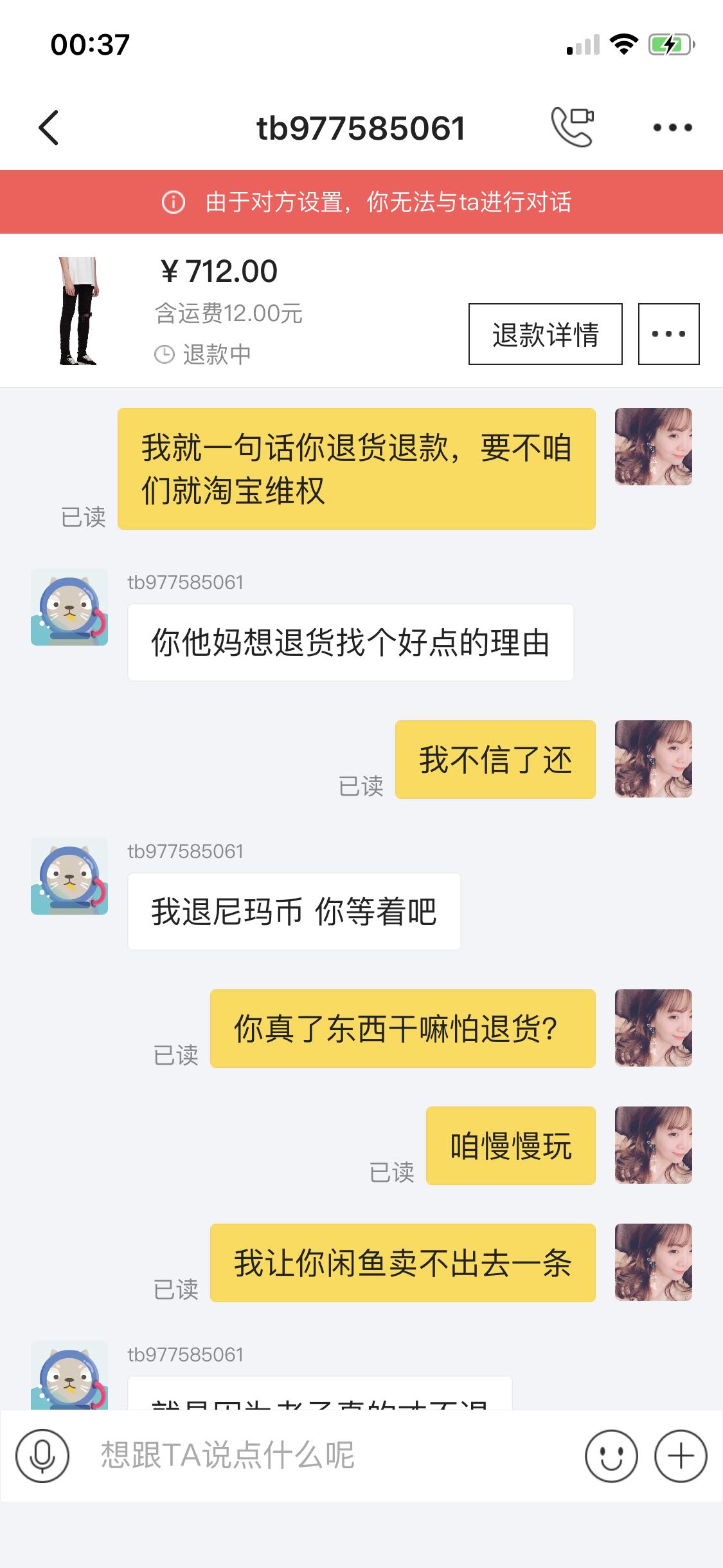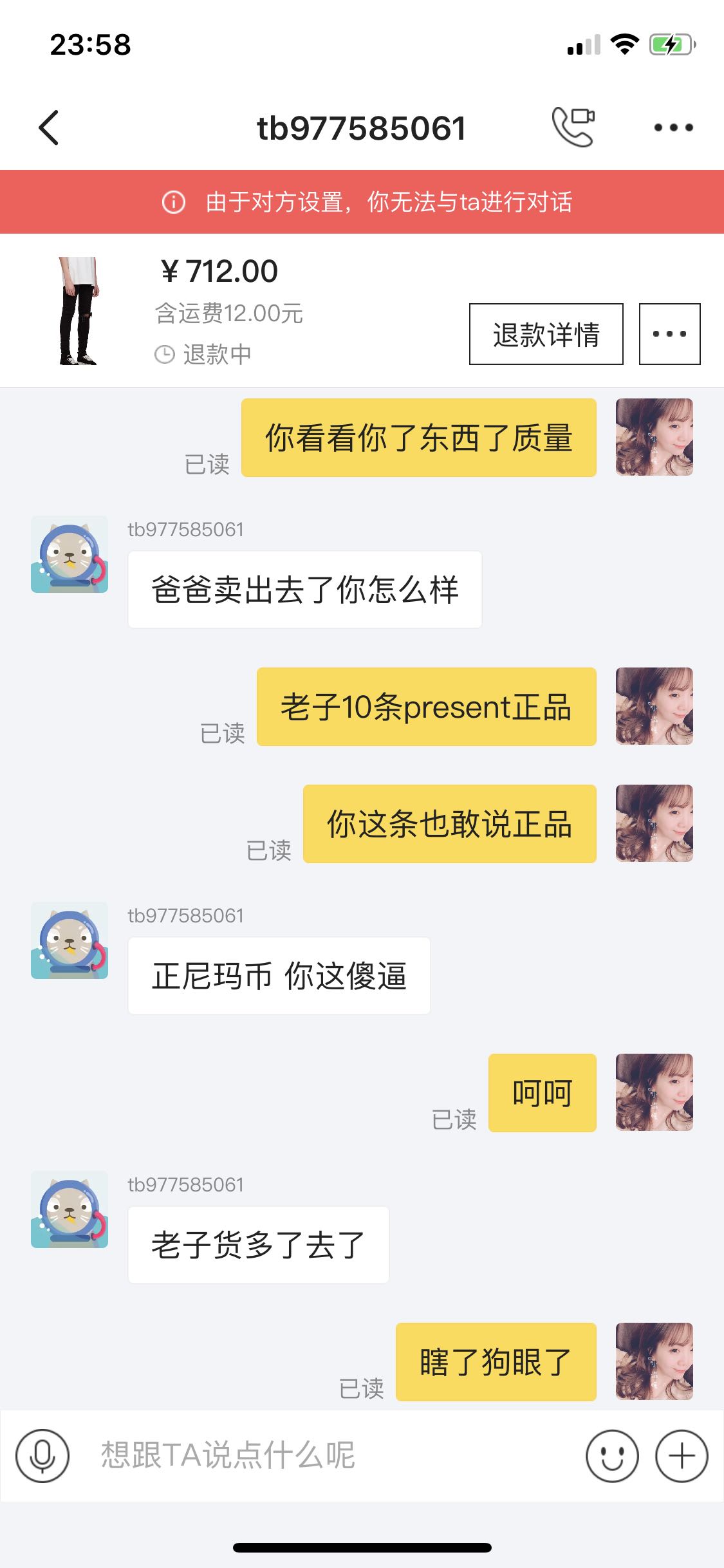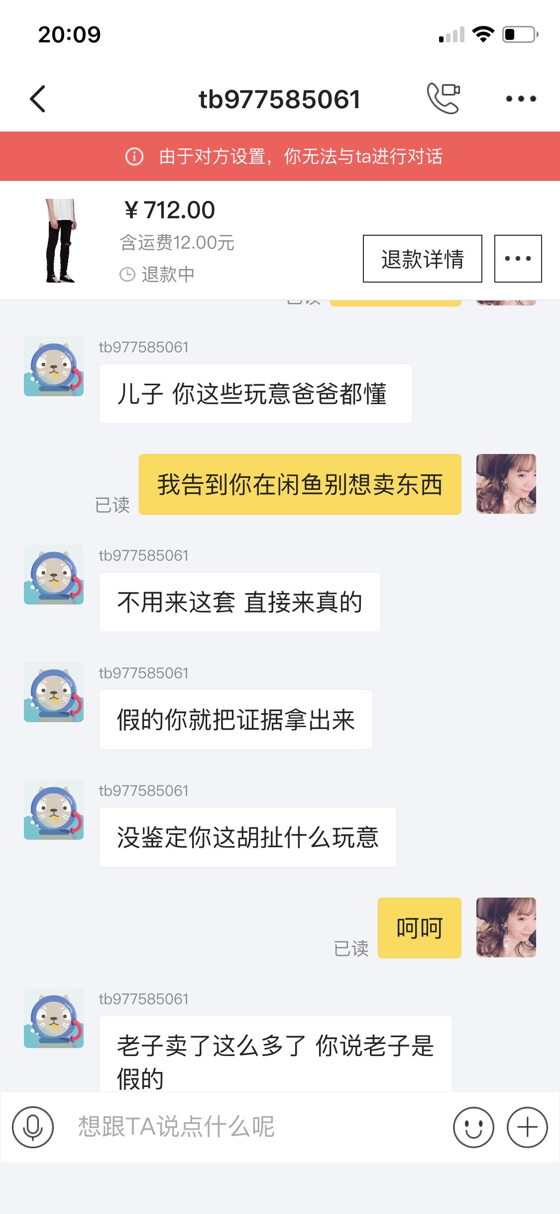 闲鱼这个卖家言语辱骂,污秽不堪,一直以爸爸自居,直接拉黑,不予处理我的退货退款,我全部取证截屏,适当时候曝光处理