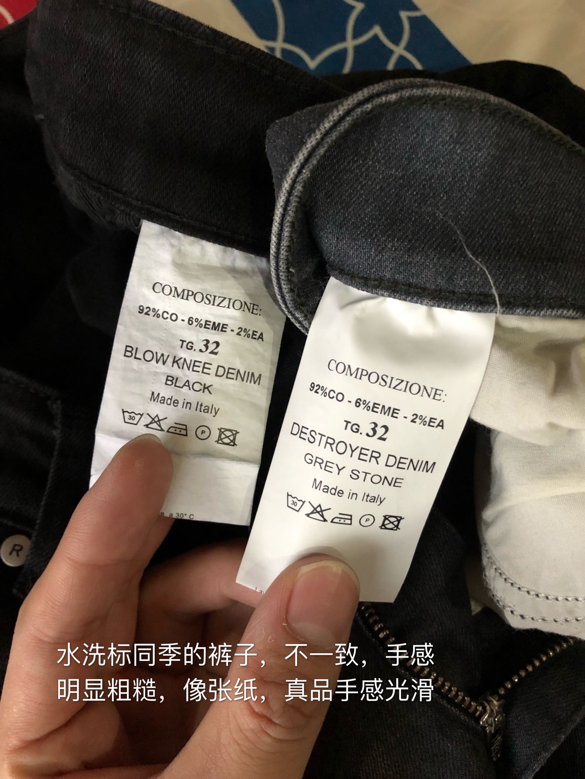 1:后标无论跟新款还是同季的都不一样;2:前挡拉链和我3条正品包括同季的裤子都不一样,做工粗糙;3:裤兜小R五金没有做旧处理跟正品不符,4:破洞处拉丝弹性与正品不符,破绒粗长不规则;5:裤脚完全没有弹性,正品裤脚是有弹性的,6:腰围弹性不足且偏大,此款正品腰围略小且有弹性;7:面料手感与正品差一个档次;8后腰皮带扣位置与正品不符,对比三条正品裤子。