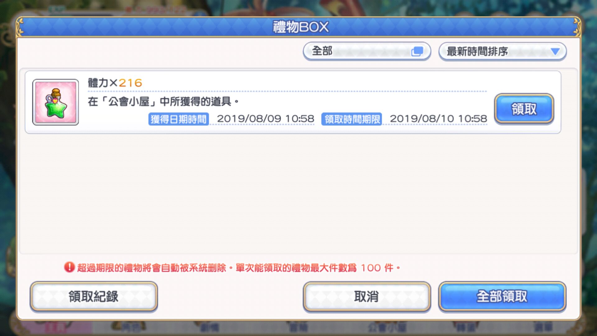 体力到990满了就溢出发到礼物盒子里