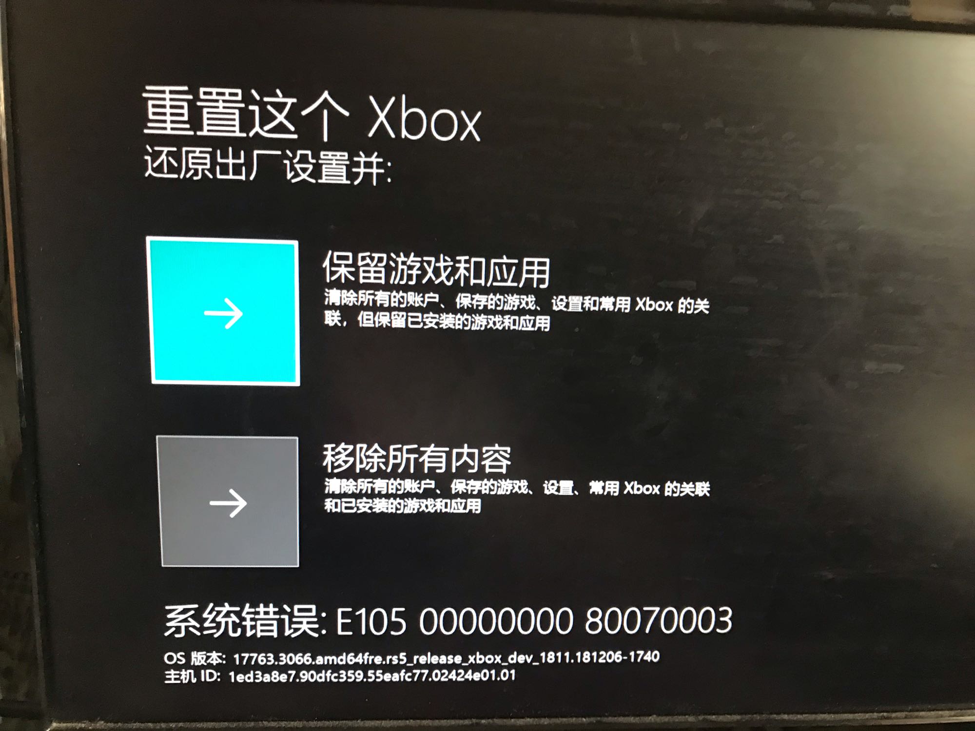 大佬们救救我阿……本来系统错误e105就卡在图一的界面了(手柄没反应),好不容易把手柄和主机连上了手柄终于有反应了之后选择重置这个Xbox又卡在图二的界面了。。求救
