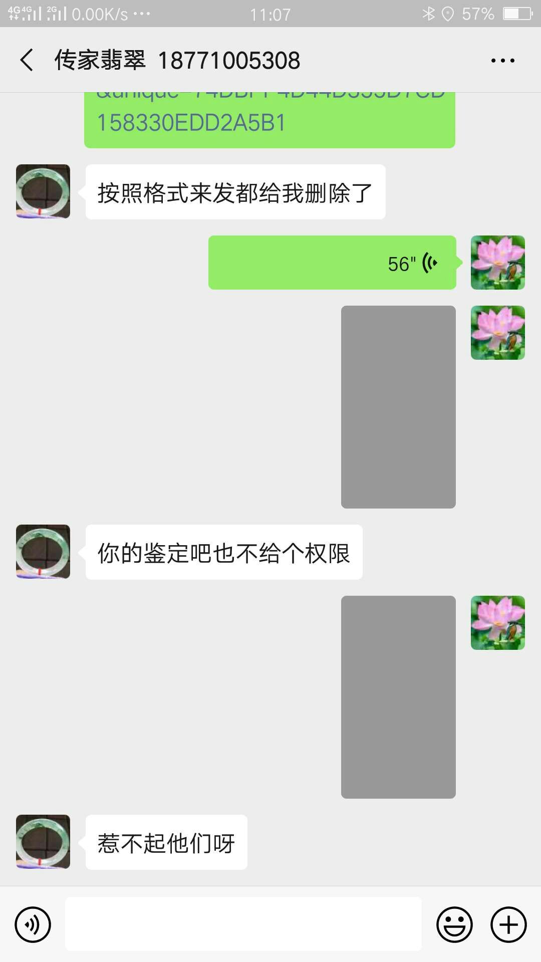 这是她传播谣言的截图的原图,尤其让我气愤的是有人给我造谣说我在群里拿垃圾料当冰种翡翠料卖,我群里好几百人可以证明我重来没拿垃圾料当冰种翡翠卖,我群里人都知道我在群里重来没有卖过翡翠,我是个玩家,我买了很多翡翠赌石,因为我们黑龙江黑河这加工能力不行,加工个镯子也要三百,我翡翠赌石都没加工,邮到别的地方加工又不信任,所以我重来就没卖过翡翠,而且我有闲钱,也不需要我卖翡翠,我平常爱好就是炒股票,实际上我在我的翡翠群是不活跃的,我在我的股票群才活跃。请给我造谣人拿出证据截图,我在群里拿垃圾料当冰种翡翠卖,我保留报警权利。