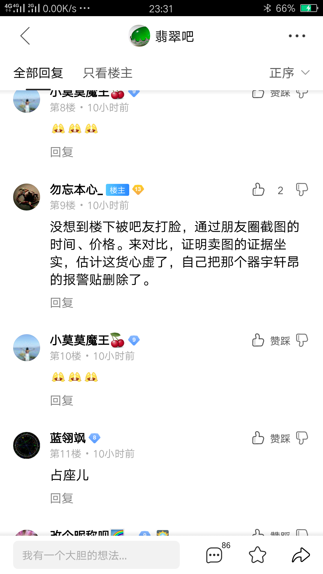 现在冒充和百度合作旗号的翡翠吧某骗子吧主,正大义凛然的在翡翠吧驱逐转图卖图的传家翡翠,我想问一下翡翠吧某骗子吧主,当初你收了传家翡翠的黑钱,现在纸包不了火了,你在驱逐她,为何当初你收她黑钱,给她认证商家?帮她坑翡翠吧有些吧友,当初转图卖图的穆老师和小加也是你收了黑钱给他们认证商家,坑翡翠吧有些吧友,在纸包不住火时,你在出来驱逐,当初你为啥收他们黑钱?帮他们做认证商家,帮他们骗翡翠吧某些吧友。