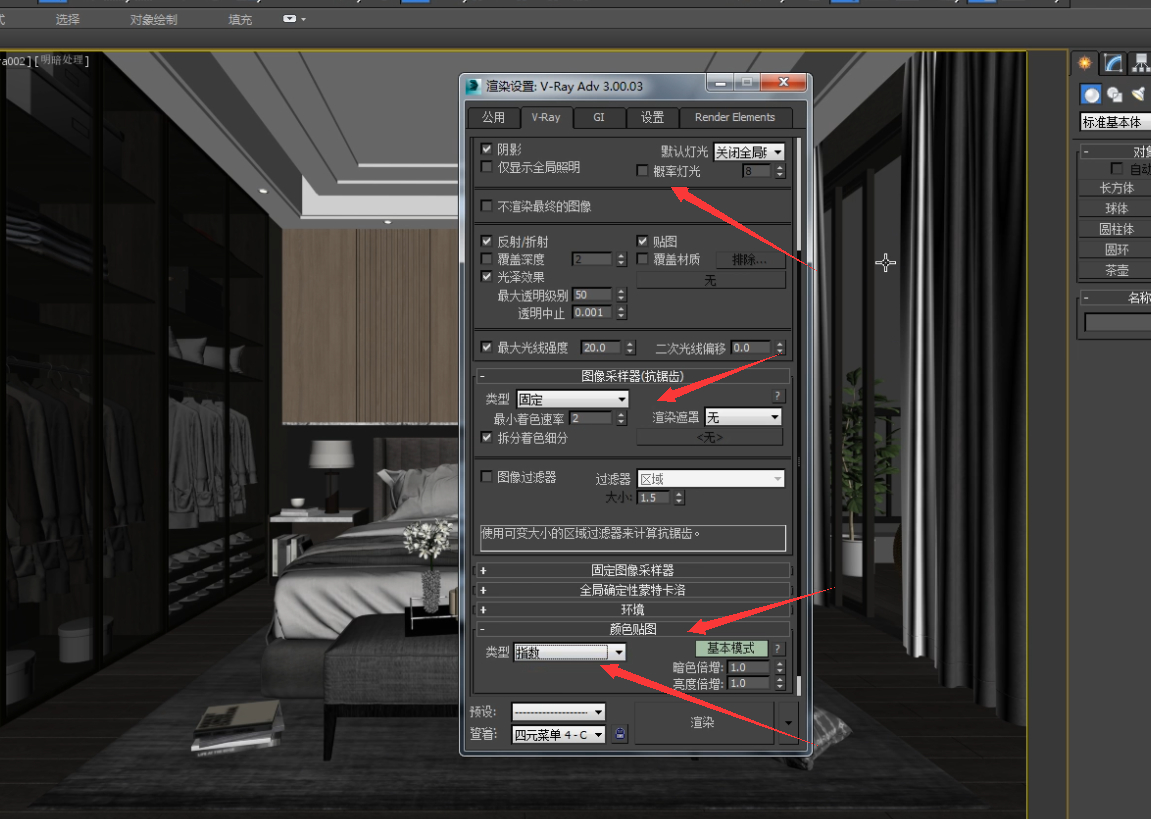 然后进入到全局开关,把概率灯光关掉,颜色贴图类型设置成指数,因为我们做的是白天灯光类型,参数修改好了可以渲染下看看