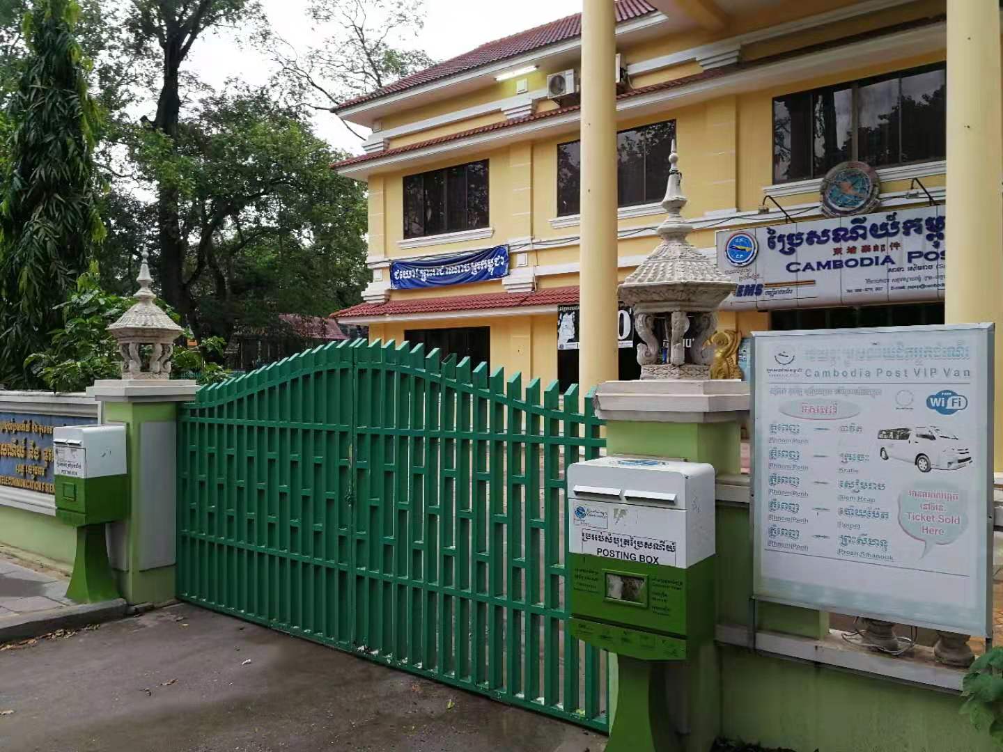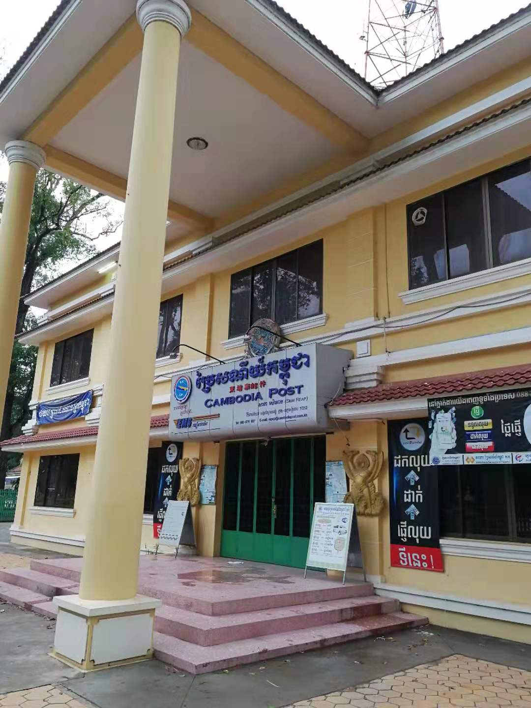 暹粒市区重要景点 国王行宫、姐妹庙、皇家公园,是旅游团必须去的地方。上图标明邮局的具体位置,从皇家行宫走路仅仅3-5分钟。这个邮局有很明显特征,可老远一眼就看到。因为邮局有个几十米高发射塔,暹粒高的建筑很少,所以1-2公里外都能够看到几十米高的发射塔。