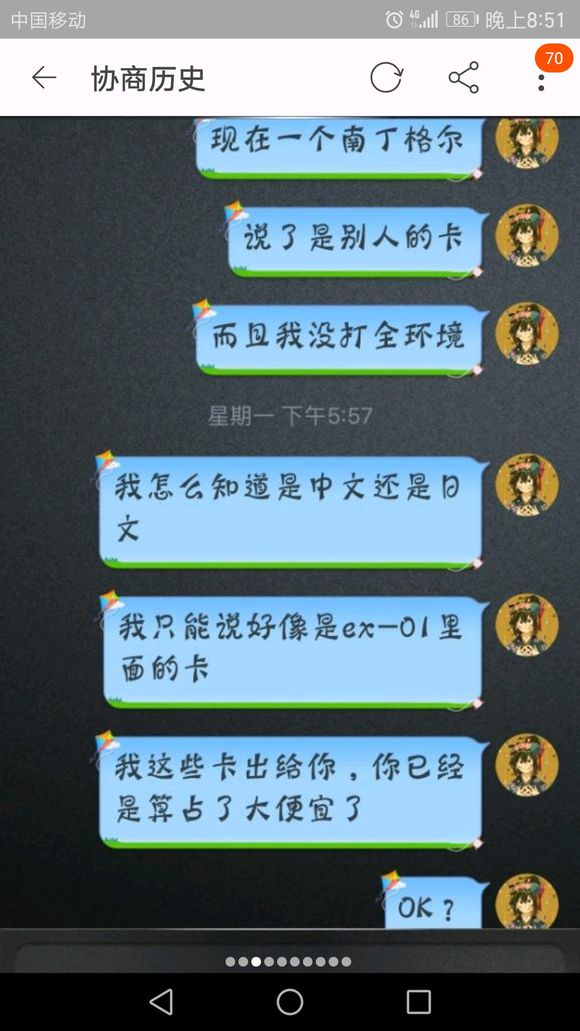 您定位的很准确呀··我在卡牌上的确是发烧级的。。刚接触这个游戏,不到三个月,花了五千多软了··没想到这么小的圈子也能遇到这种人,不过不会影响我对这个游戏的喜爱的。。另外,怎么投诉咸鱼淘小二呢?