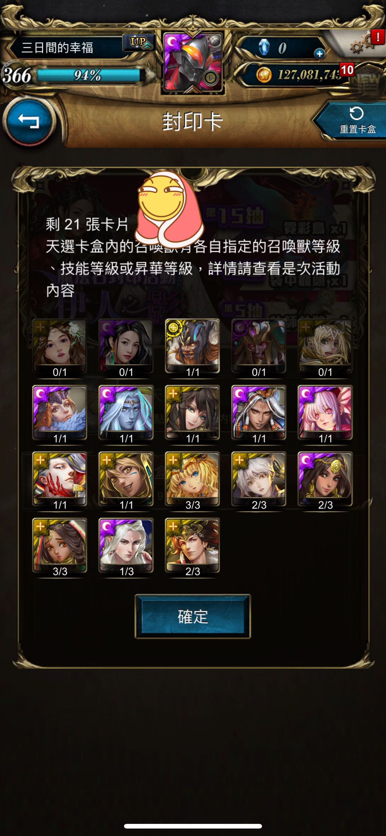 卡池里我有6张卡,抽了7抽,全重复,最大奖露娜,可我喂鸟练满了的