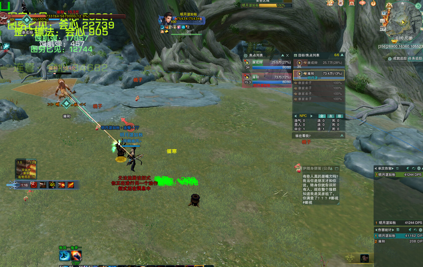 秒不掉猴子,那就等猴子激活,用藏宝洞打法,全程10尺外卡好秋风,躲好长条面向轻轻松松过关,0掉血。需要注意的是猴子血量后半段会出连续的5波长条面向,记得躲掉。还有就是如果猴子去吃桃子了,记得把猴子带到天绝里面就行了。4W3战斗时间6分钟。