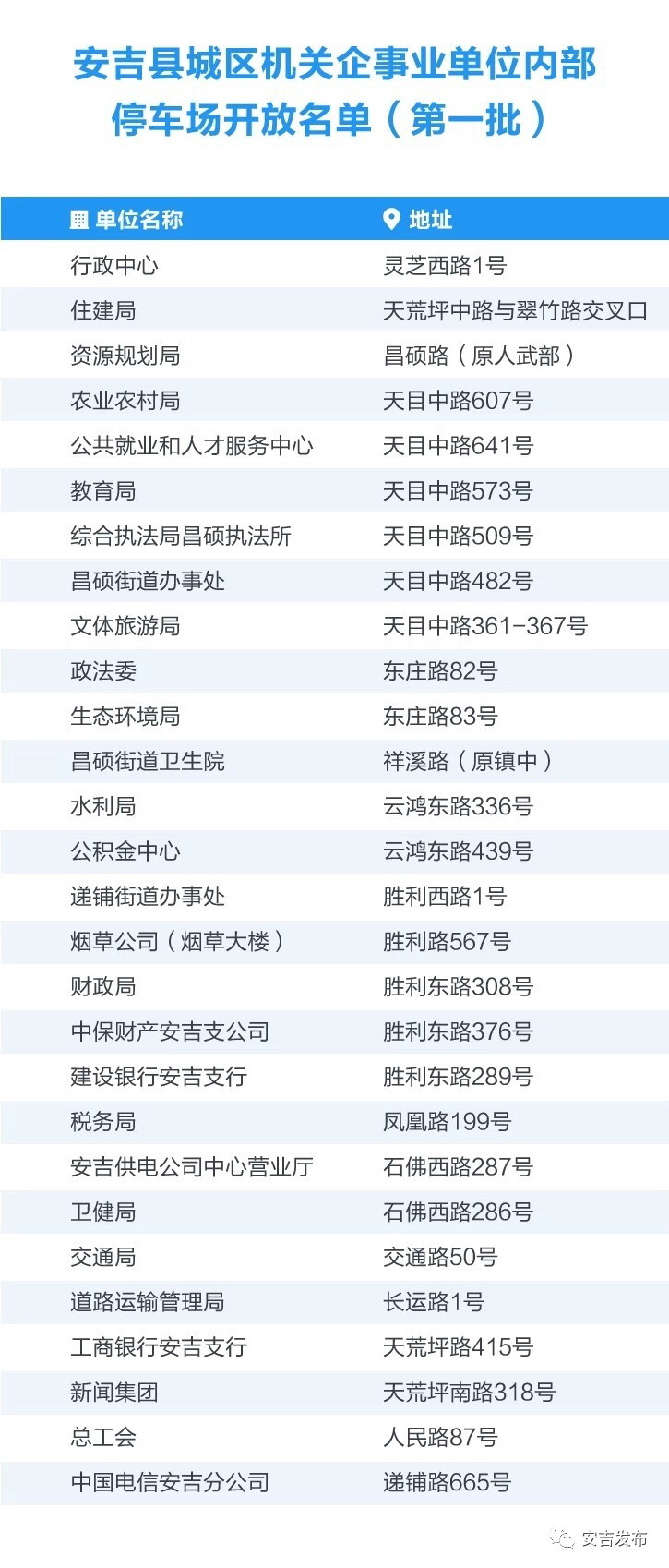为充分发挥安吉县城区机关企事业单位现有内部停车场的停车潜力,缓解城区停车难问题,创造良好的社会交通环境,利用节假日及非工作时间的闲置空余车位,向外来社会车辆开放(限小型客车),允许群众在经办理相关登记手续的情况下驶入单位内部免费停放。