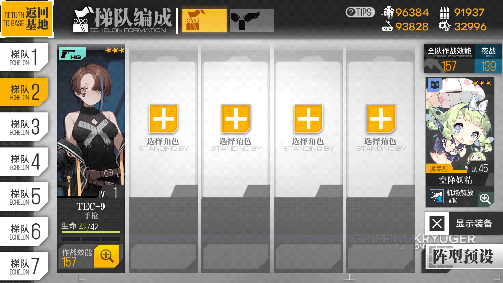 然后上一下我自己的梯队,练度不高,妖精高星的没几个,首先是前两队,妖精都是3星,空降技能10