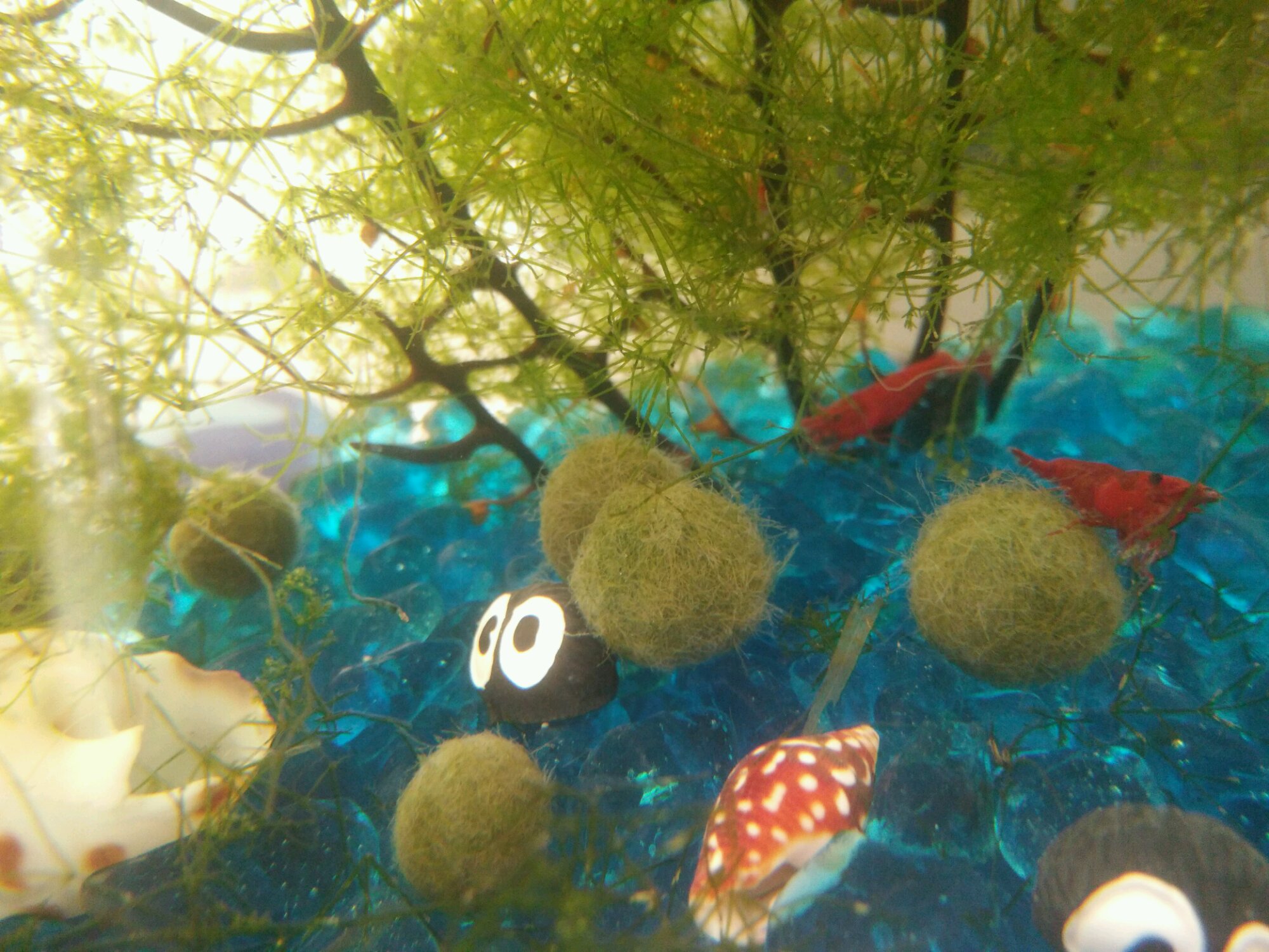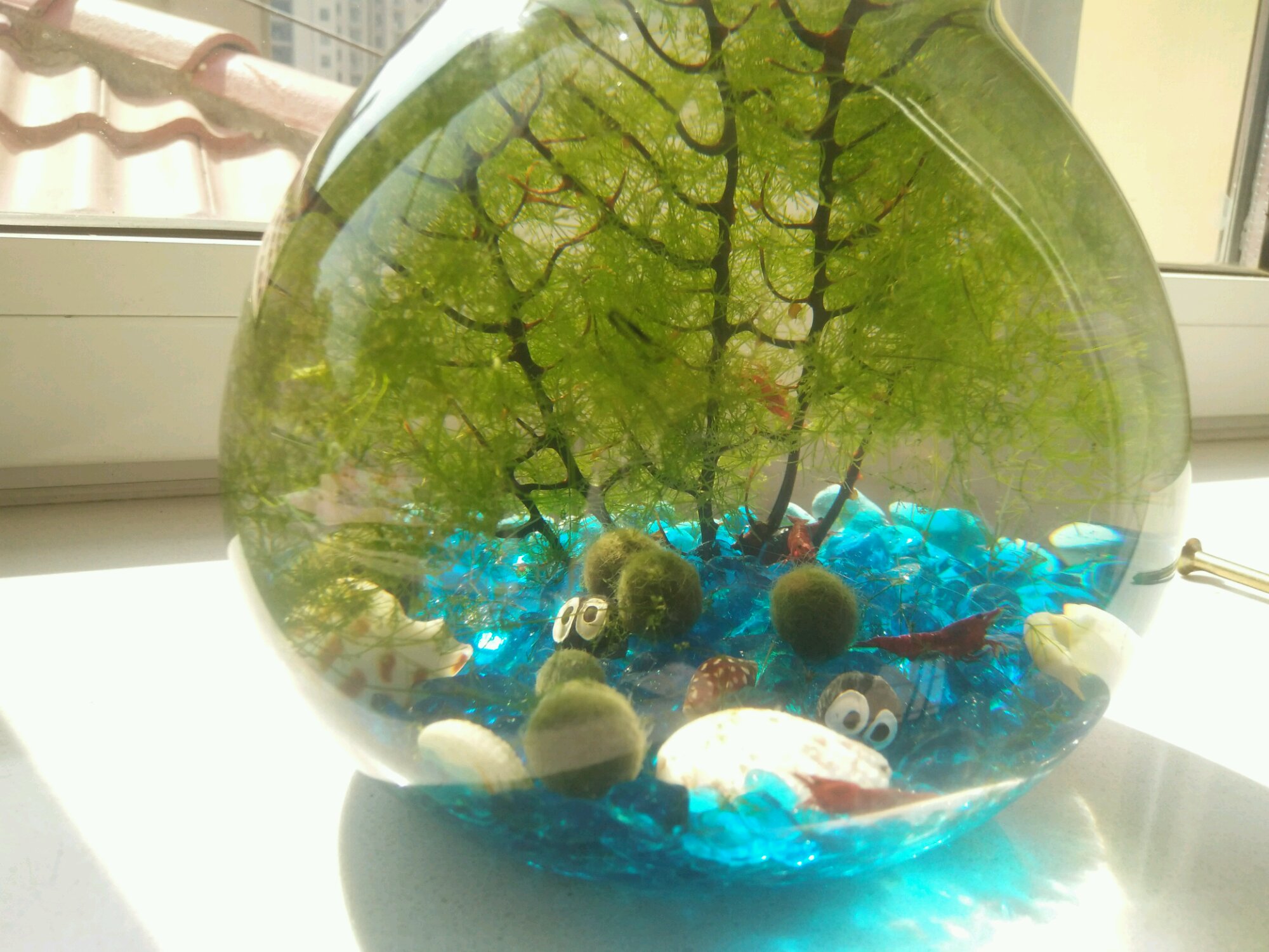 办公室养的那一缸,上个周末不小心遗漏在太阳底下晒了两天。里面的小mo表面儿都发黄了。于是又入了几颗新的,把原来的mo拆了重新搓!这下好看了,开心~