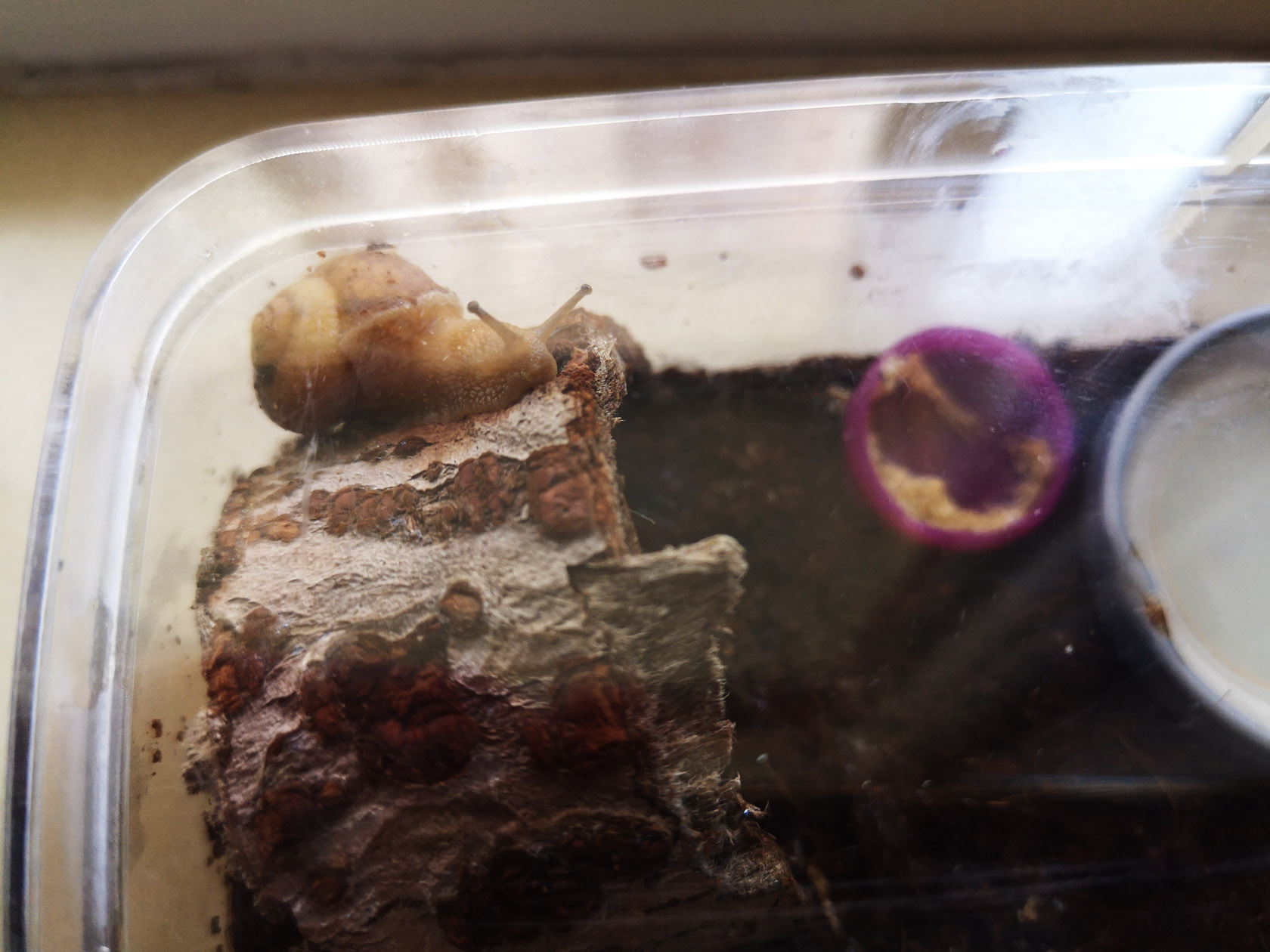 后来发现个问题,早上9点左右阳光照进来,蜗牛就开始找阴影,连续好几天给我顶翻水盆x
