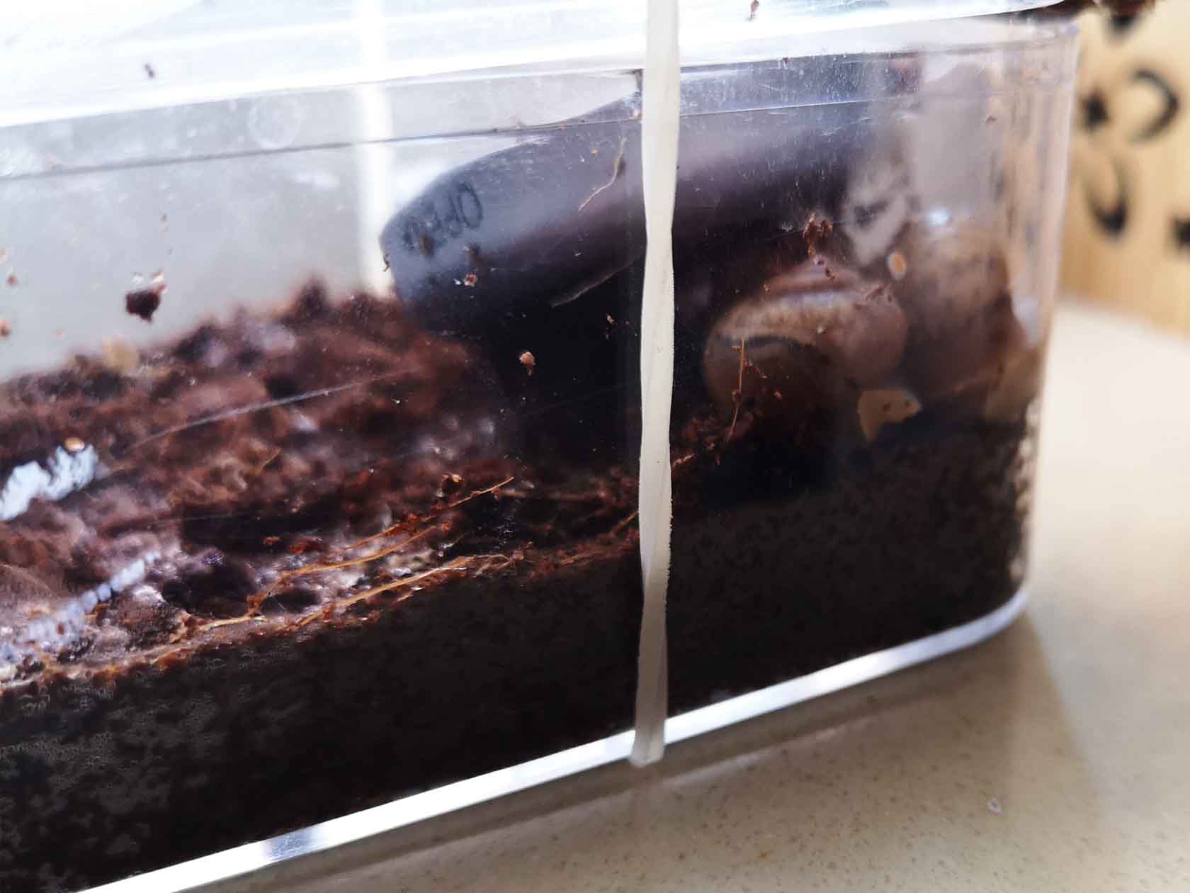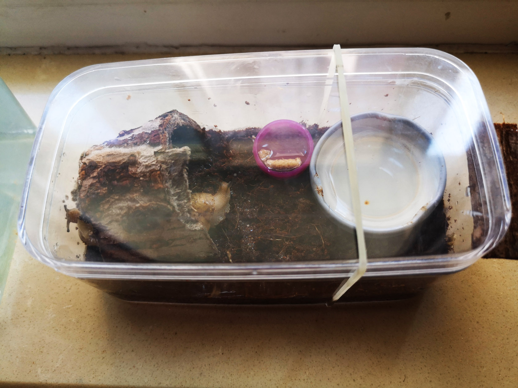 剪了一个瓶盖当食盆,瓶盖负责密封的内圈正好大小和深度都合适,放进泡软的颗粒蜗牛就来了