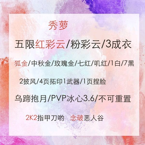 顺【电点秀姐】【5W4】【PXX2125】五红猴红七红鸡红八红苏金狐金鸡金考金国金37成衣粉白菜紫白菜谷雨情阅白螺母蓝公主粉公主蓝九曲粉人面绿不期蓝不期四色无色粉兰庭白长天白水云黑寒梅雪月复刻粉彩云8披风一代粉一代紫孔雀六翼金鱼暗夜x2青盒子夜话曲云伞珠盏滚滚4W4资历秀姐