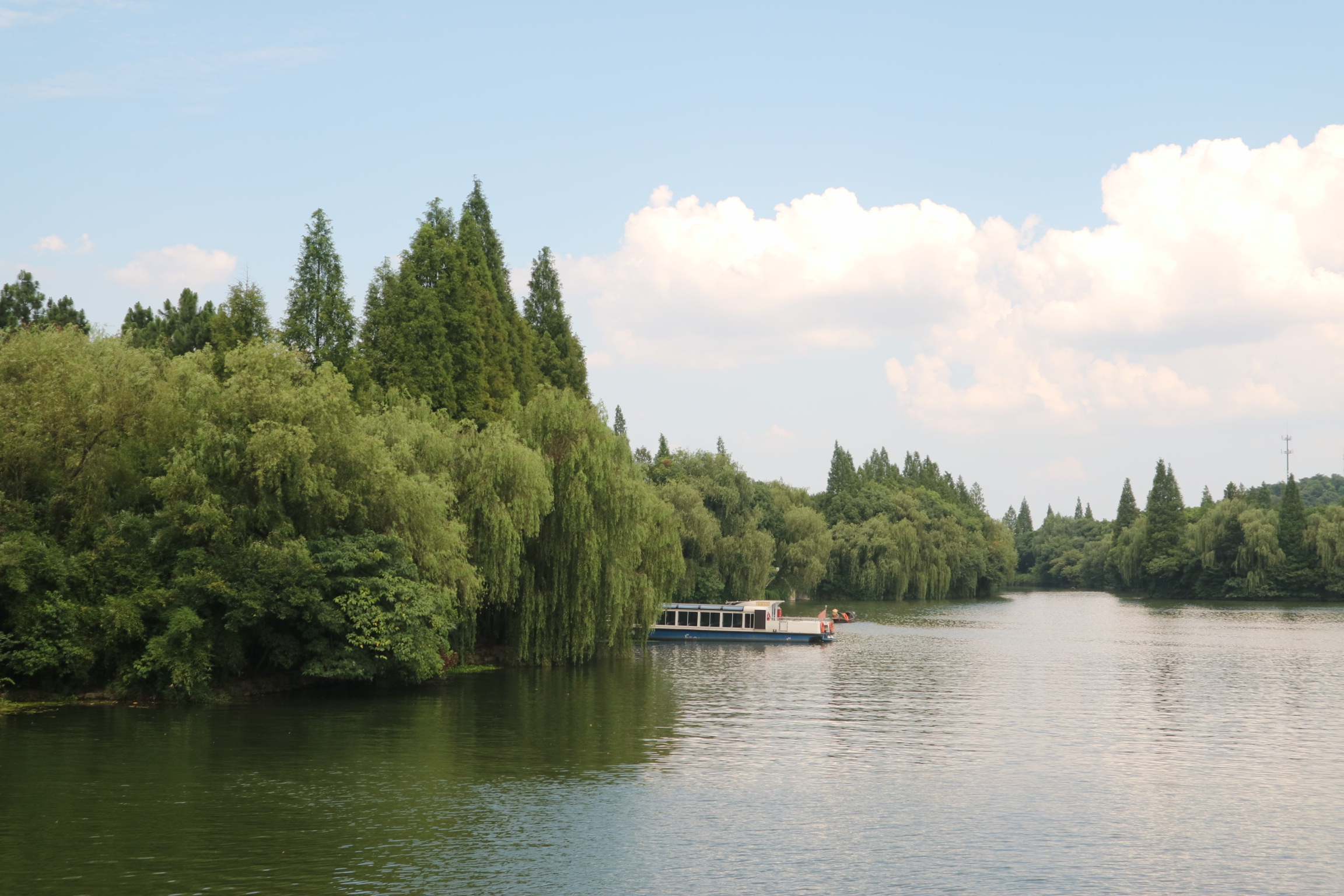 虽然是最热的时候,但这里却特别清凉,浓密的树荫将夏天的骄阳遮个严严实实。走在鉴湖边,完全感觉不到夏日的燥热,连伞都是多余的,可以尽情享受夏日湖光山色,听蝉噪绿荫,彷佛回到千年前最人与自然最和谐的时刻。