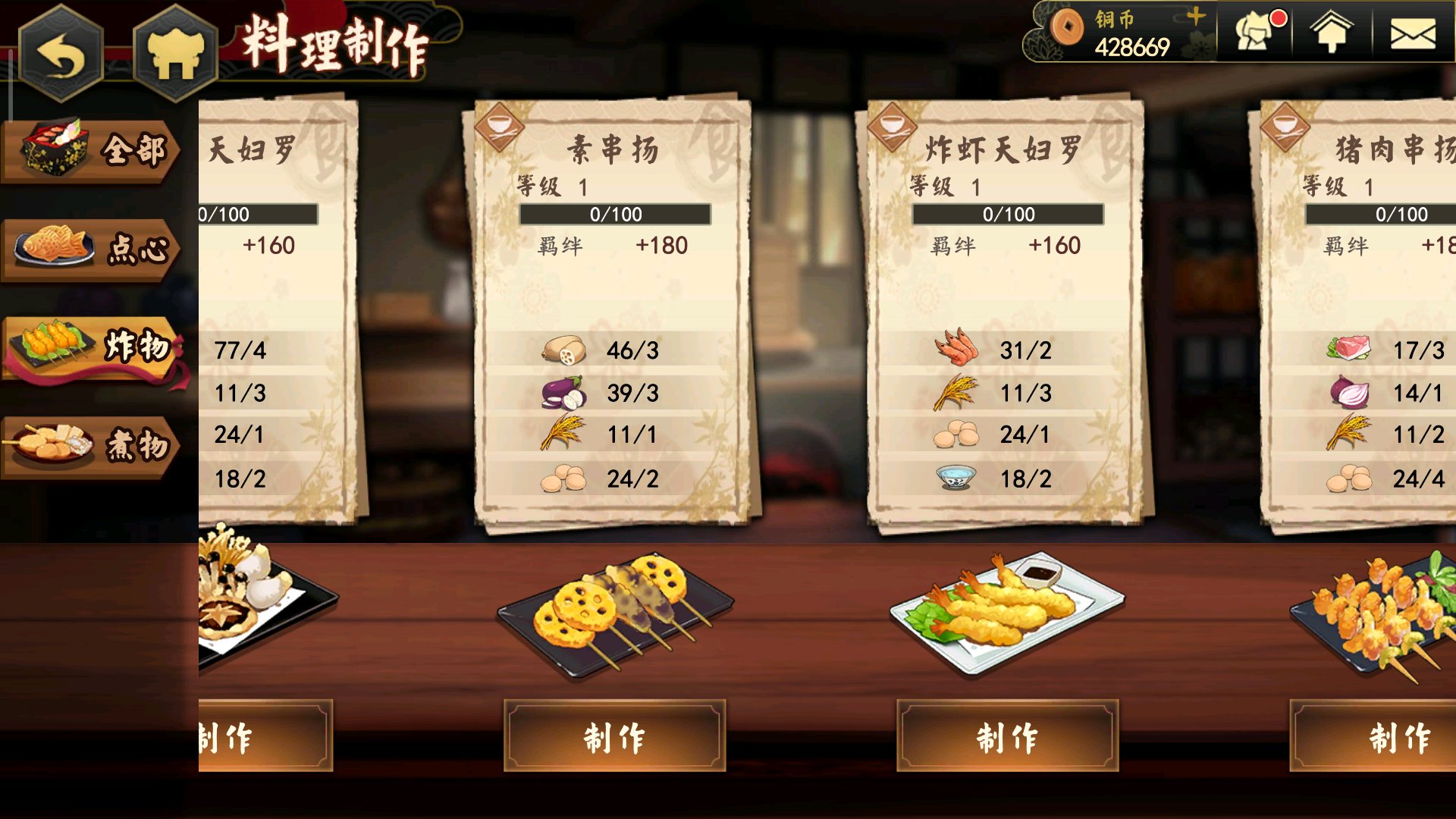帮你看一下 游戏里面菜谱上鸡排是322 天妇罗是4312 猪肉最近涨价我缺货 所以猪肉那个我还没做出来