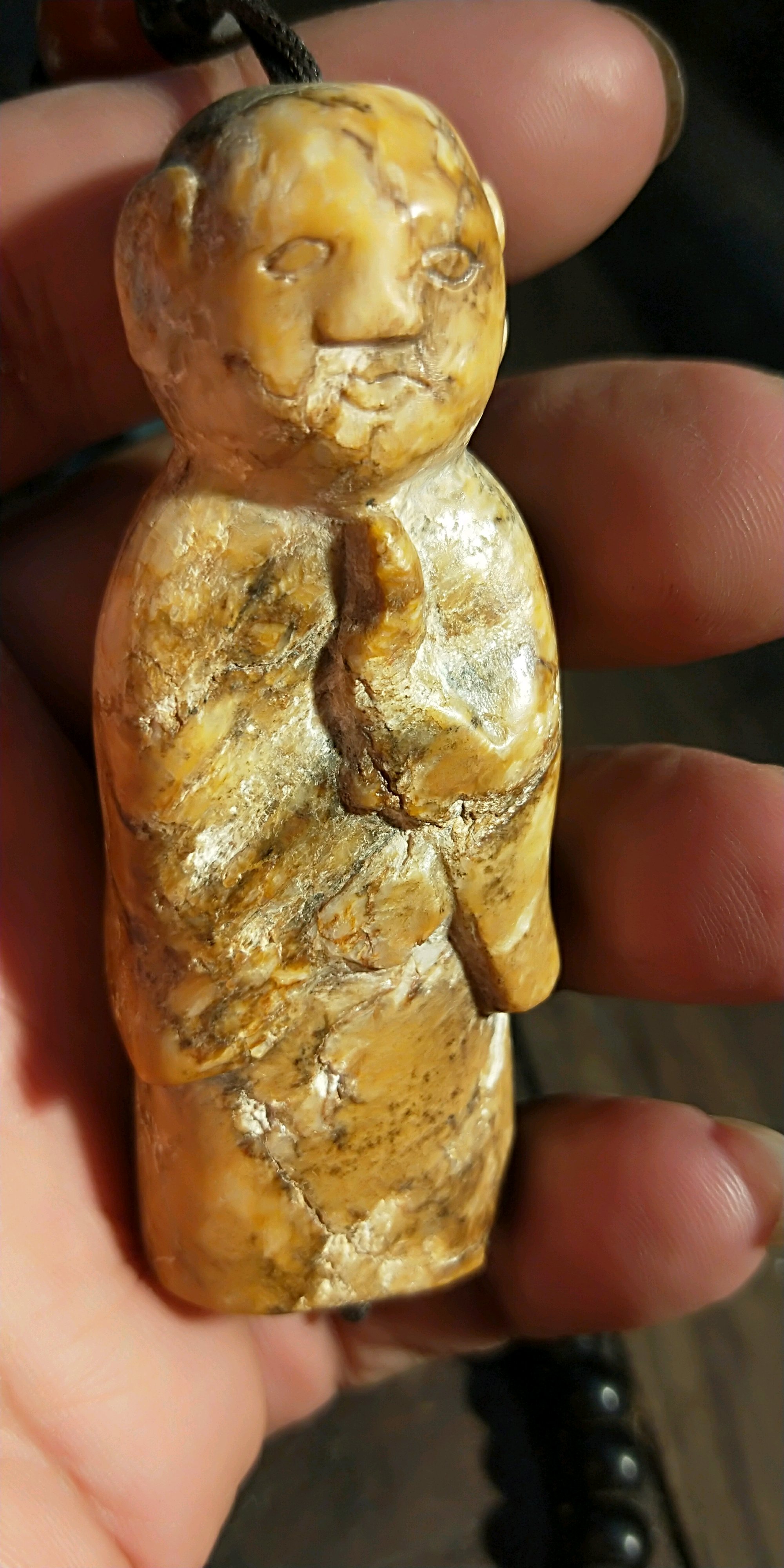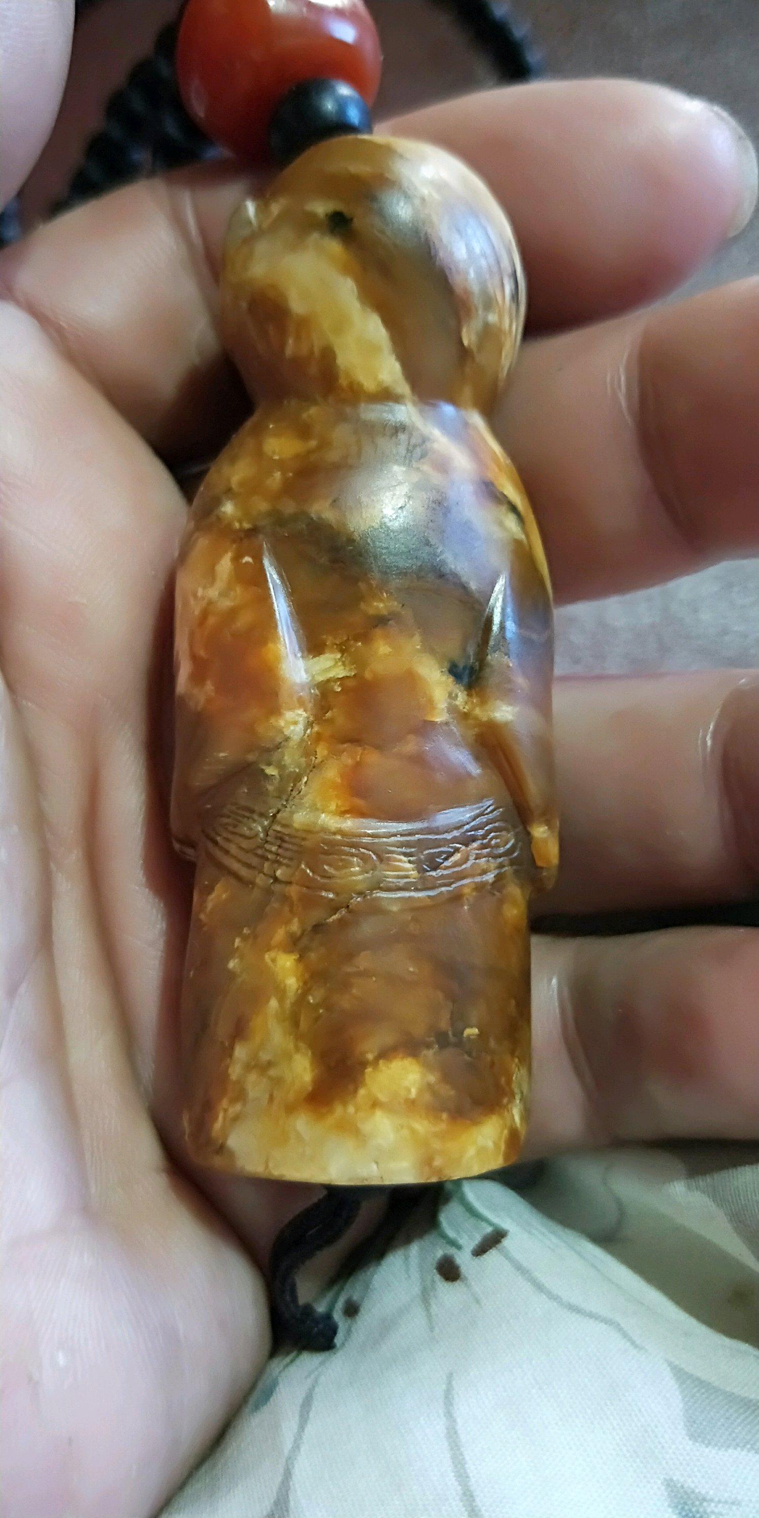 從型制看不是新石器時代之物,因那時沒有佛教,背的紋飾渡姆河太陽紋亦近似良渚旋渦紋。裂處,沁處理不好。器表包漿不均衡,疑似加溫上蠟。如說錯請糾正。