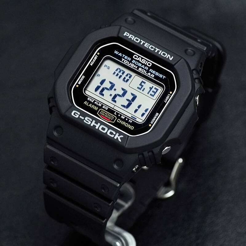 G-5600基本型号,11年左右上市 ,黑色经典系列;国内最开始流行起来应该是在周杰伦的《头文字D》。 黑色超经典、简单大方的设计,加上超抗震耐摔的特质,适合运动时佩带,也非常适合各类风格服饰的装扮。