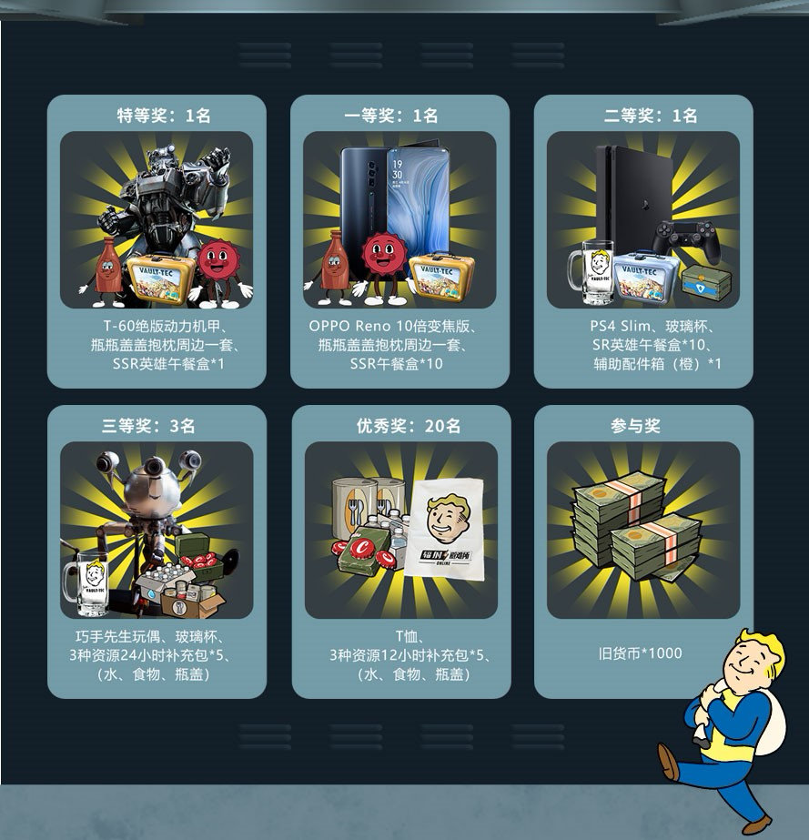 这次的视频大赛可是有奖征集哦,而且奖励超丰厚——T-60绝版动力机甲、OPPO r10手机、PS4、精美辐射周边……