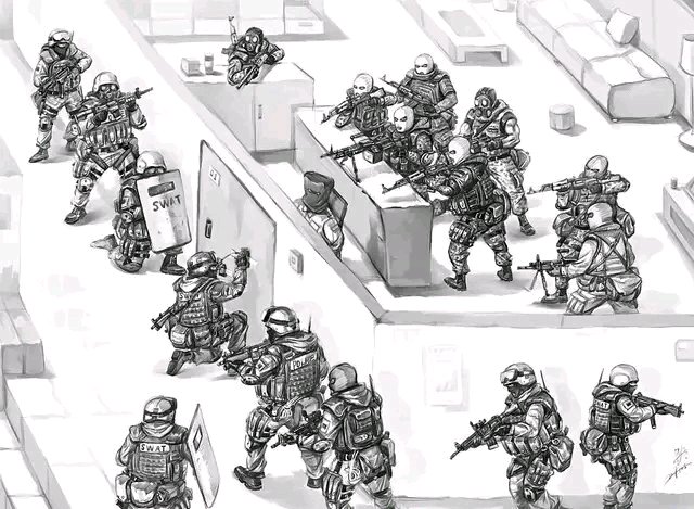 如果要强攻,侦查室内情况后,用催泪瓦斯/催眠瓦斯/烟雾弹干扰视野,盾牌和火力压制从正门突破优先解救人质,背面和侧面安排贴片,二楼准备垂直进攻打击掩体后的匪徒。