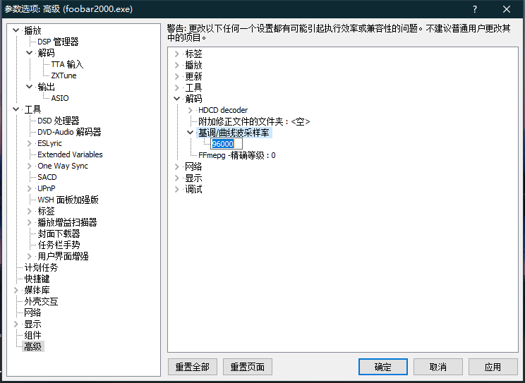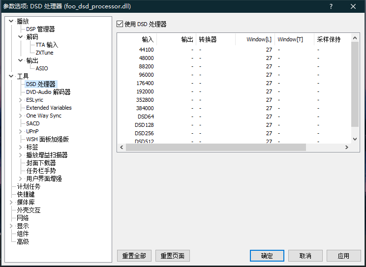 这样设置不对,不能勾选DSD处理器,DSD和PCM那只能选DSD,PCM你想升频,可以选择DSP插件,重采样率用96000,播放DSD就不要这个重采样了,