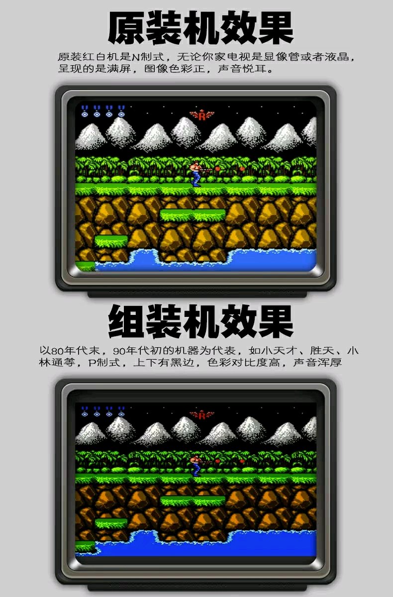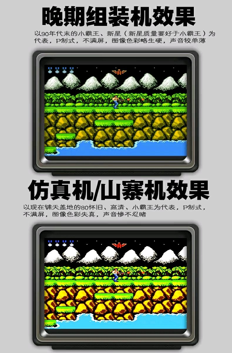 山寨和组装不都一个意思吗? 原装的初期,也是有问题的。 N 制式 和 P 制式的区别,不能作为质量参考。 只有声音属于 质量范围。 从 95年开始,豆机就是山寨机主流了。 但是 有的厂家 声音做得好,有的厂家做得差。 图像颜色是 调色板的区别。不同的 CPU 公司,可能会选择不同的调色板。导致同一个游戏,颜色有差别。 N 制 显示 范围比 P 制大,那是因为 P 制分辨率 比 N制高。 N制的图像,到了 P 制,没办法满屏,比例也无法维持到 4比3。 现在的 山寨机,NTSC 的版本比 PAL 的版本多。 而且 RETRON HD 这款 机器,支持 HDMI ,支持 NTSC PAL 选择。想要什么效果都可以。