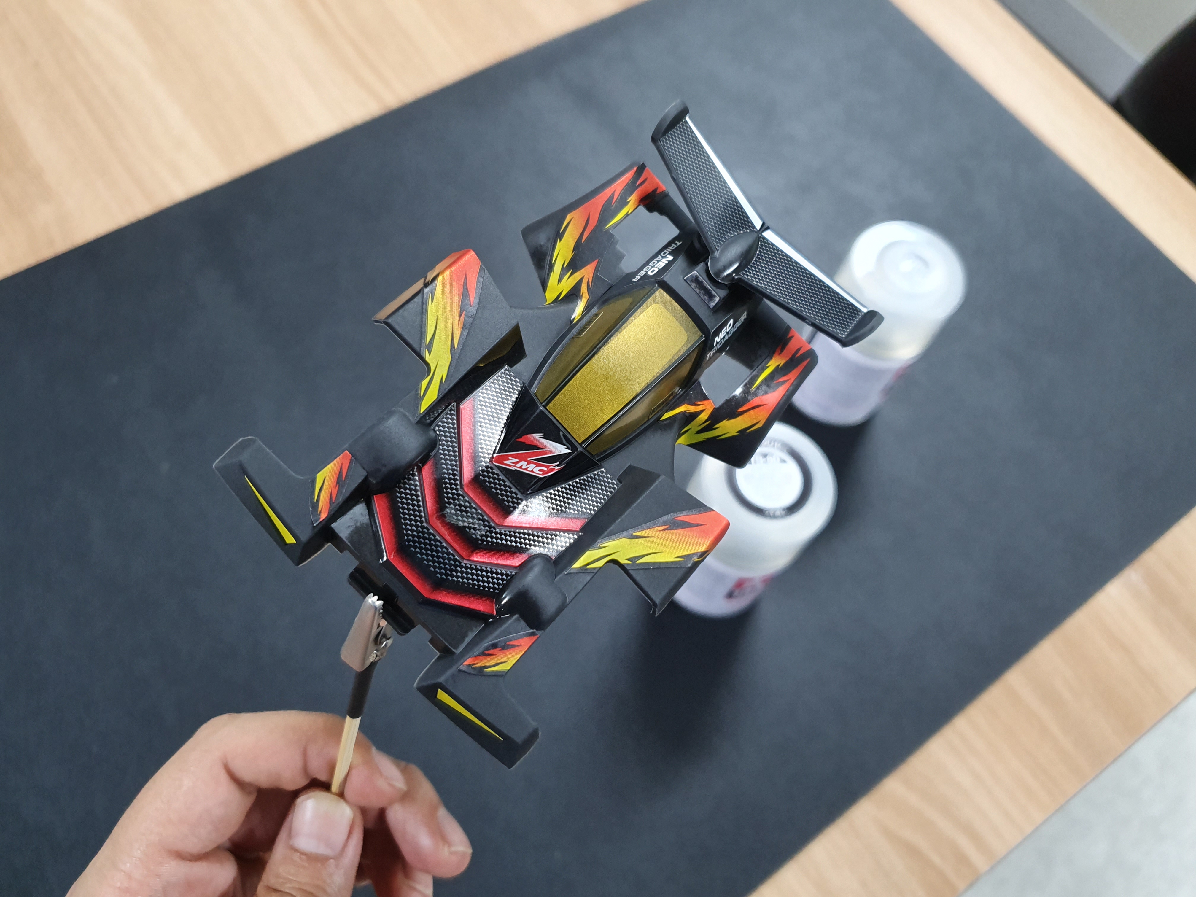 先喷一遍水补土、再喷色漆、贴纸、然后光油,质感会强很多。罐喷太贵,用到最后颗粒变大,雾化不好了,买个充电的气泵喷笔套装吧