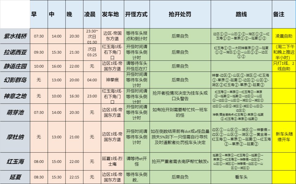 各服务器狩猎车时间,可能有点变化