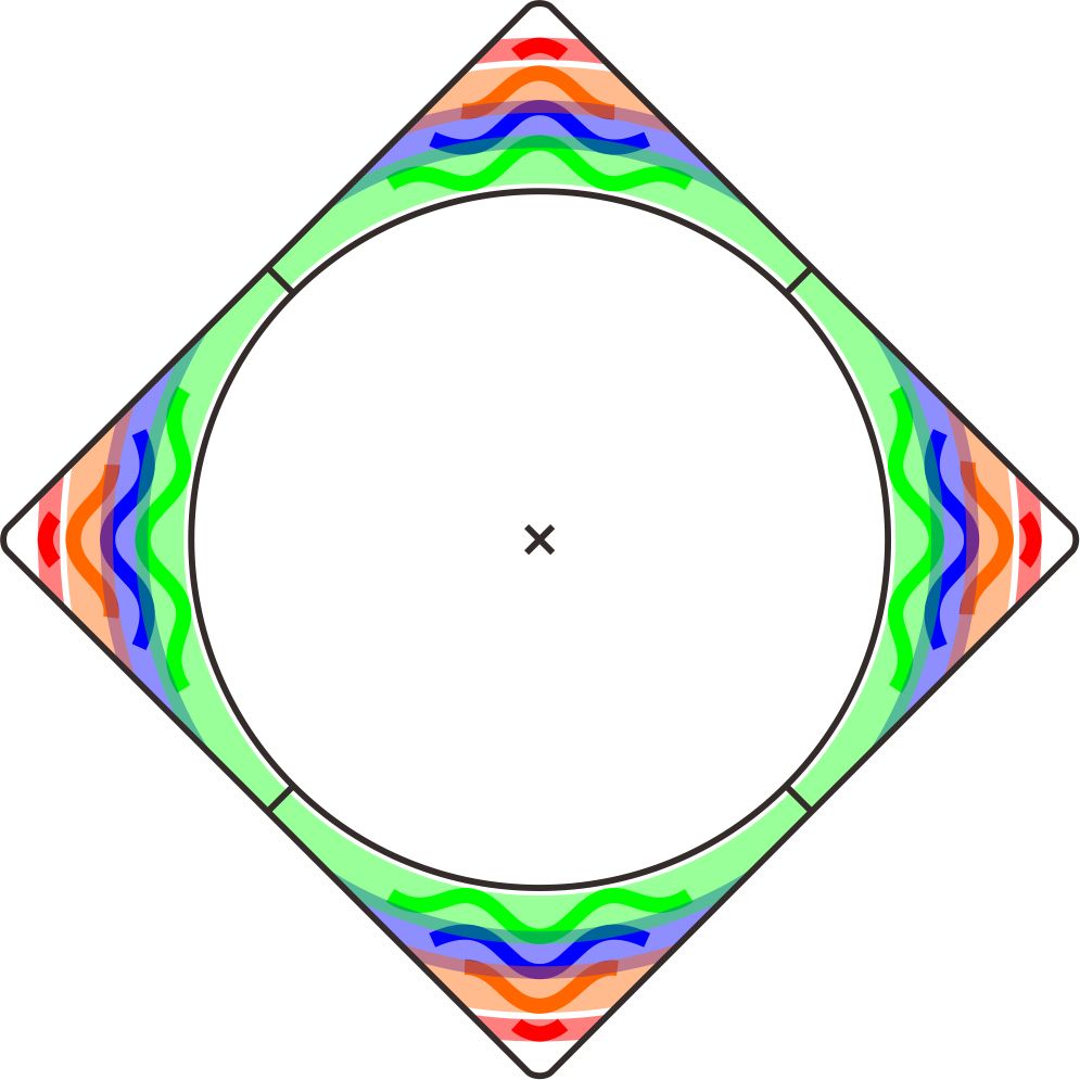 防粘槽的作用主要就是防粘、锁油这两条,且防粘槽在魔方旋转时能覆盖到的面积决定了其作用的大小。传统防粘槽都是圆弧状的,大致有以下三种情况(下图中灰色为防粘槽,红色为旋转时的覆盖面积)。