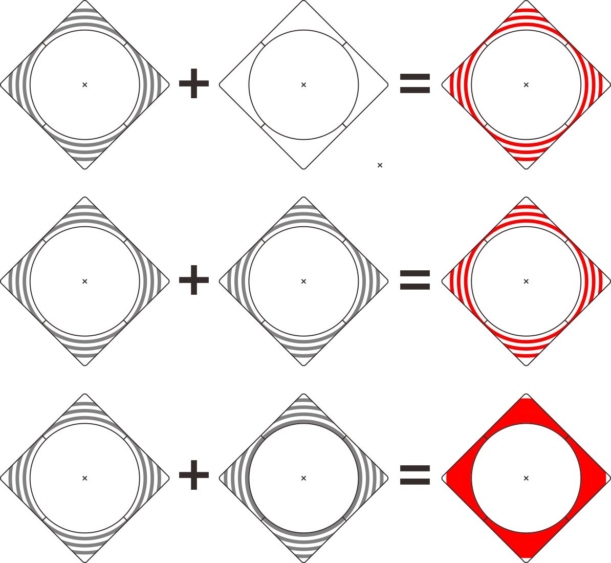 防粘槽的作用主要就是防粘、锁油这两条,且防粘槽在魔方旋转时能覆盖到的面积决定了其作用的大小。传统防粘槽都是圆弧状的,大致有以下三种情况(下图中灰色为防粘槽,红色为旋转时的覆盖面积)。如果摩擦面的一面有防粘槽,另一面没有,那覆盖面积就和防粘槽的形状吻合(其实二阶魔方不可能一面有一面没有,我只是懒得画三阶了);如果两面都有防粘槽,且形状一样,那么覆盖面积和只有一面有槽时一样;如果两面都有槽,而且是交错的,那旋转时几乎能覆盖整个摩擦面。