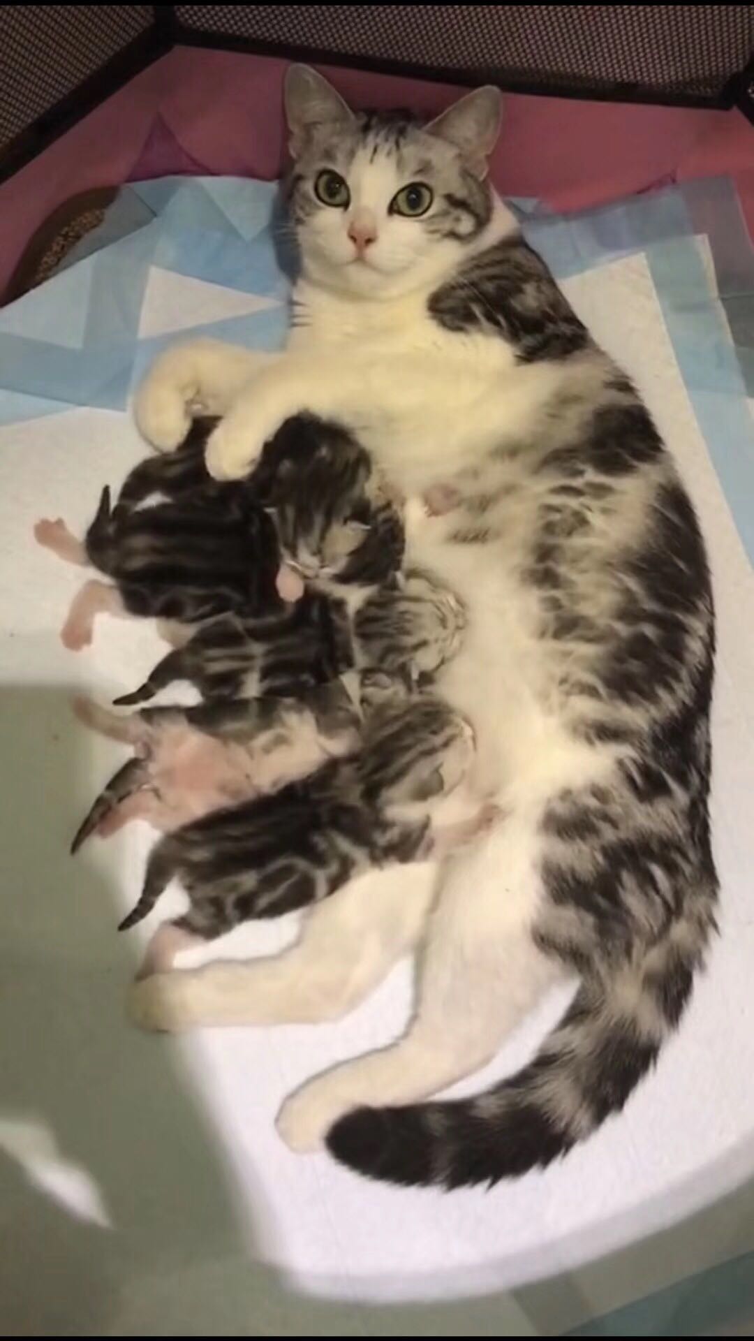 记得预产期是6/8号还是9号,正好是个周末,还想着在家里帮助皮蛋生产的,结果没想到提前6/5号生了,当时我和老公都在上班,还好家里有摄像头看着,我从摄像头里发现皮蛋一直在沙发上舔毛几小时没动过、我就觉得不对劲了,让我老公请假回去看看(我老公公司离家近点)等我老公赶回家皮蛋已经全部生完了