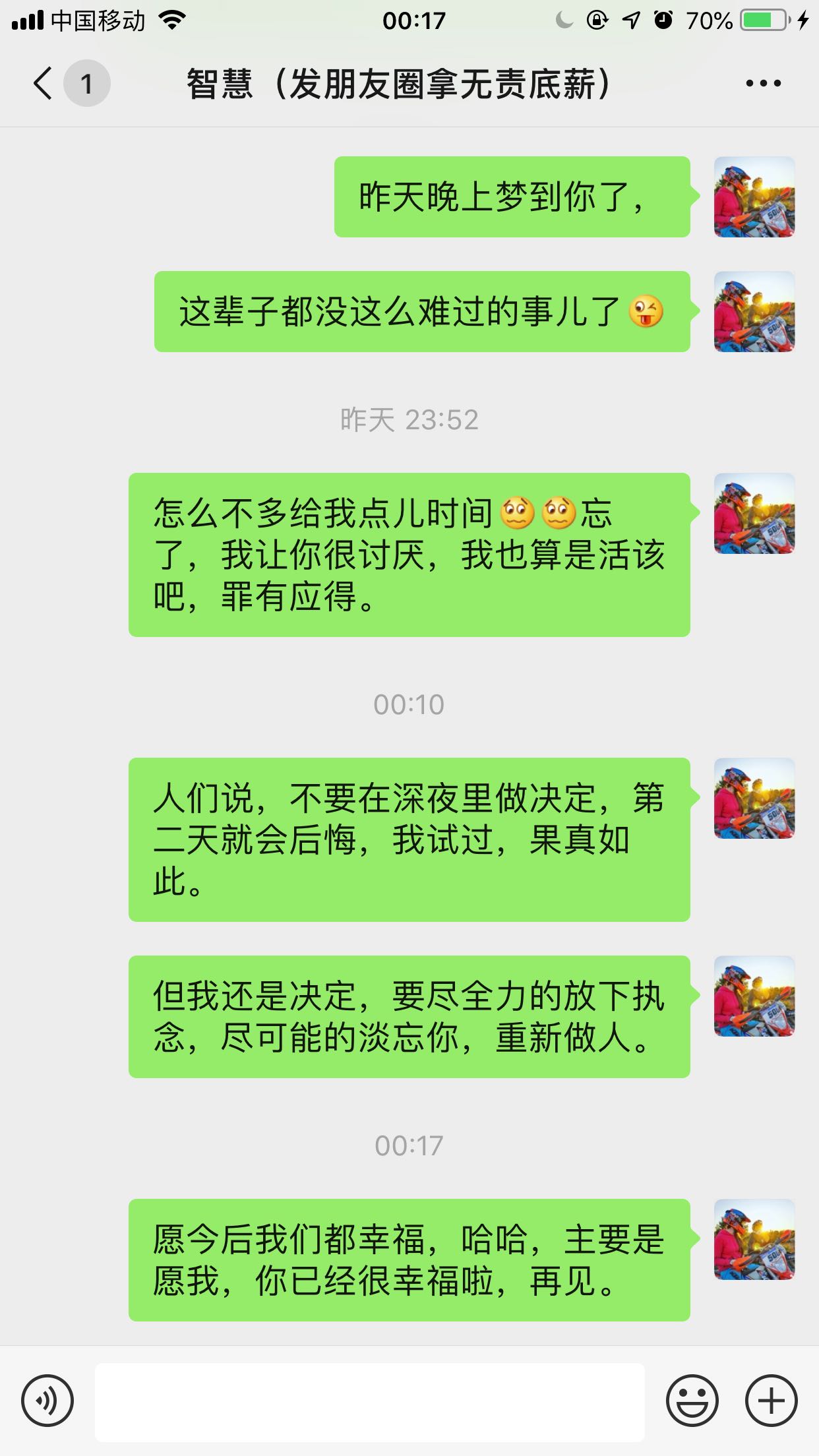 你就告诉我嘛,以后就不给你发消息了,你总是不愿意回,我也不勉强自己了,虽然以前也经常这样说,但是以前那是你没有谈恋爱,我总觉得,我还可以有机会慢慢讨你欢心,而现在不行了,所以以后就不打扰你了。