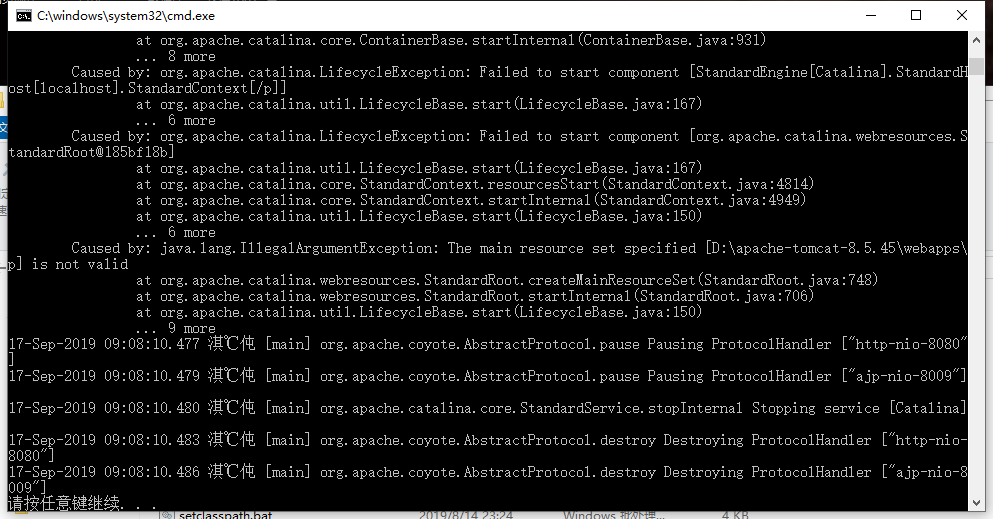 之前下载tomcat8.5可以正常使用打开。因为有事大概一周多没有开电脑,然后现在无法使用了 ,打开就会闪一下然后黑框还在。 java12的jdk是配置好的 一直都用它写代码。应该不会有问题。请大佬帮我看一下 谢谢!!