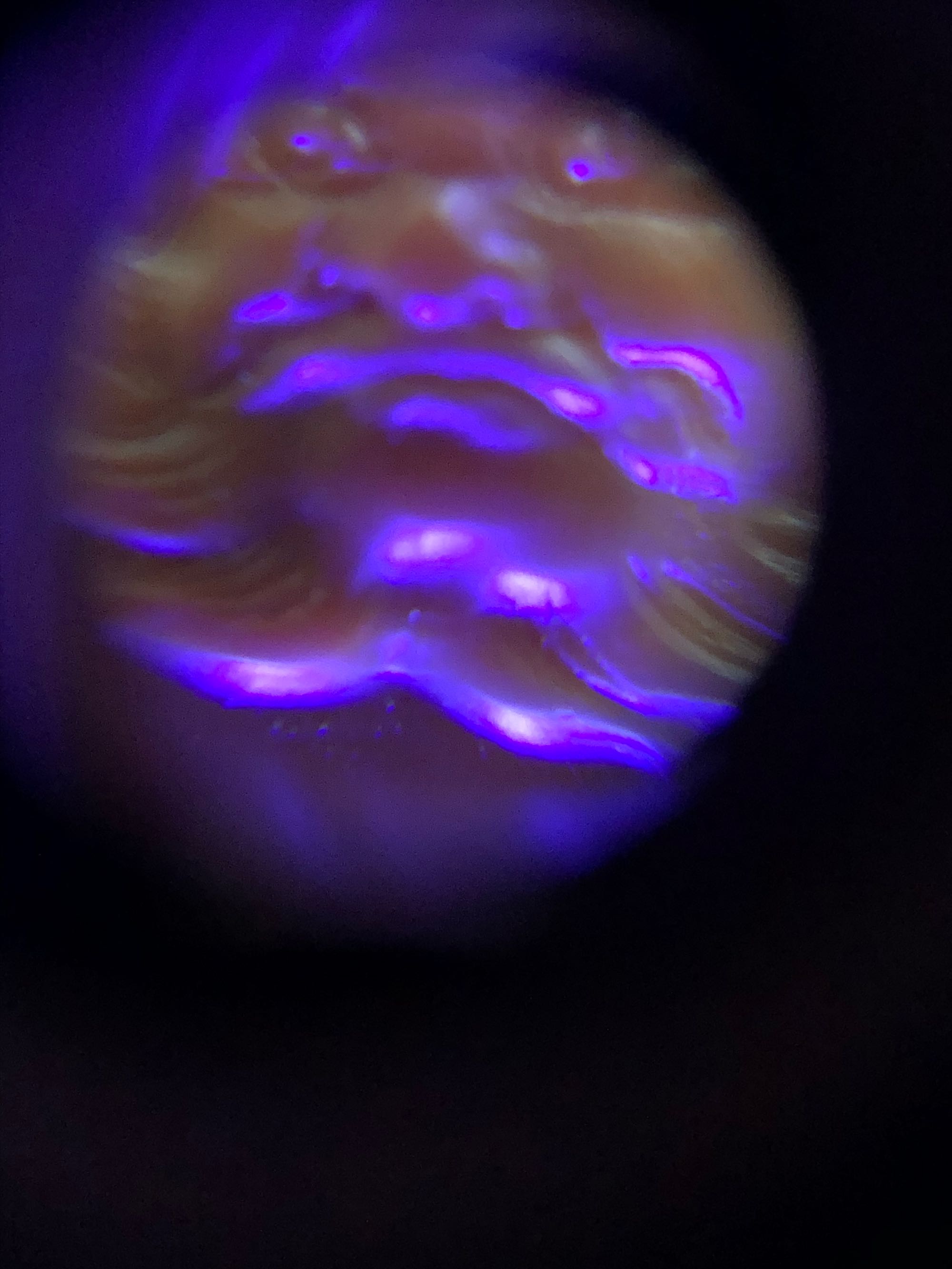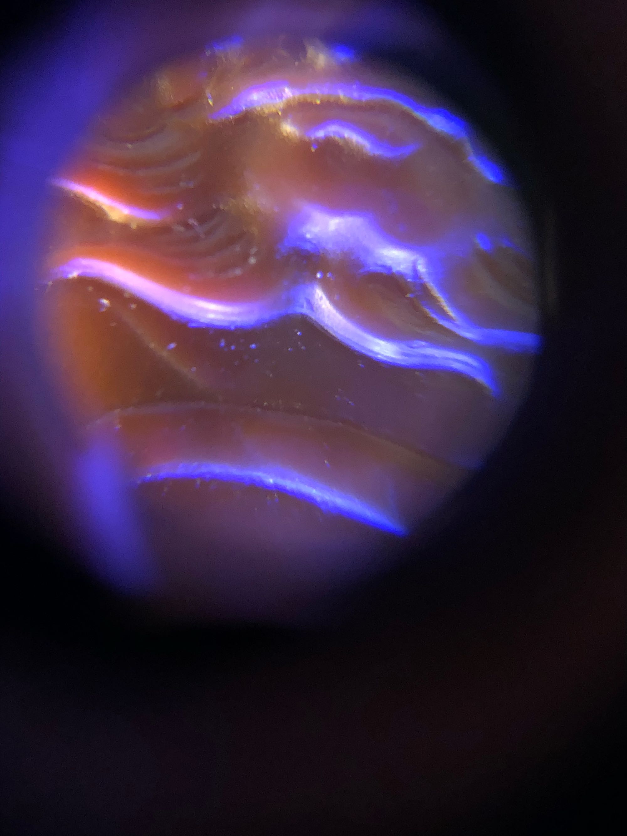 你看荧光反应的地方 都在雕刻处就很有可能是反射光 如果呈现出裂痕状那种线条荧光反应那应该就是裂