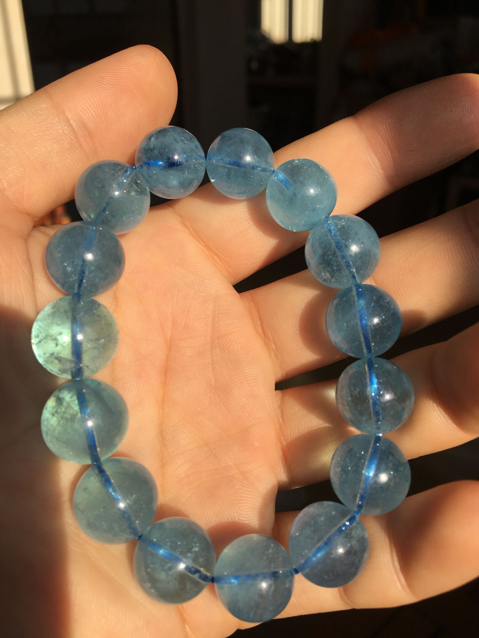 珠子内部没有蓝色的丝丝的东西。说明不是染色,现在具体就是看它的材质是海蓝宝还是托帕石,这里就有一个疑点,因为这两个宝石很像