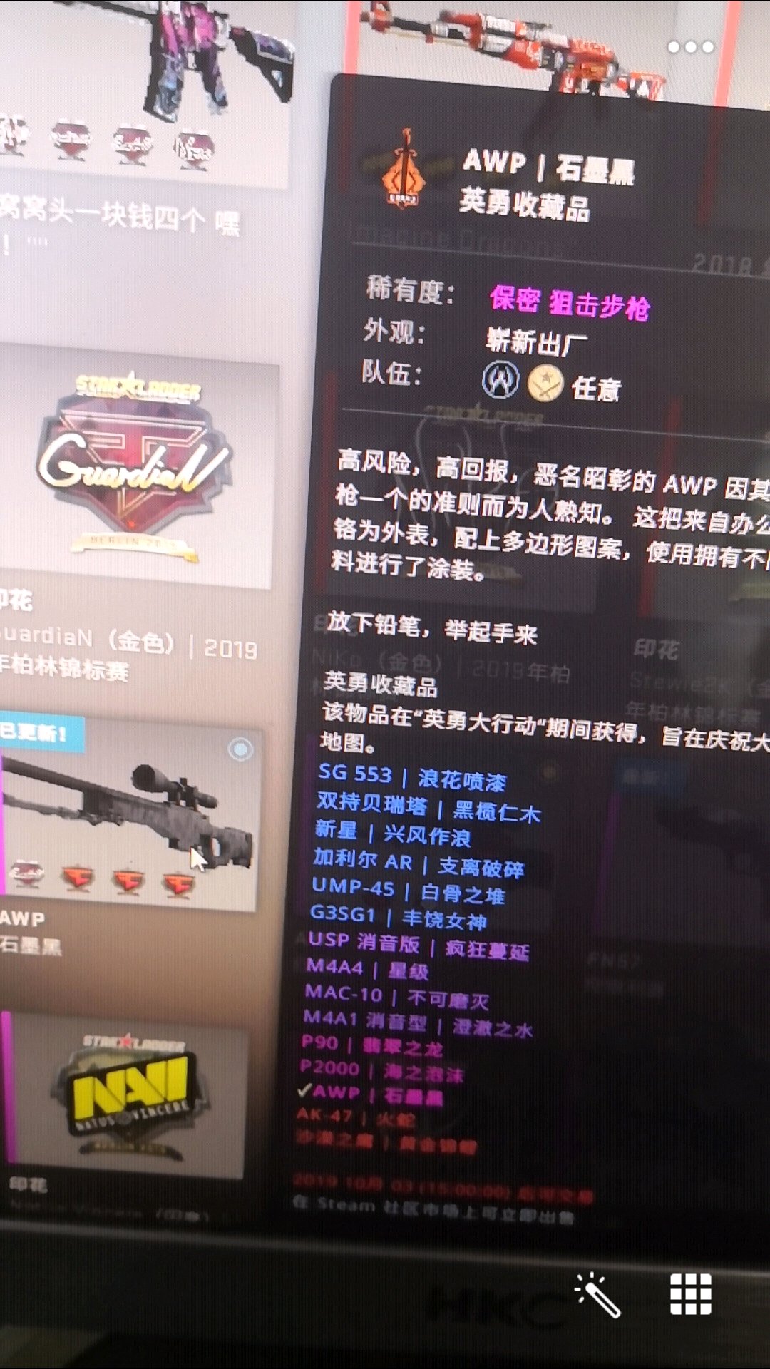 瞎jb合成,上了一把0.36磨损的恐怖蔓延,还有一些狂野六号消声,结果出个028的崭新石磨黑。。人品都特么用在这些垃圾地方上面…截止今天,四百个箱子没有金