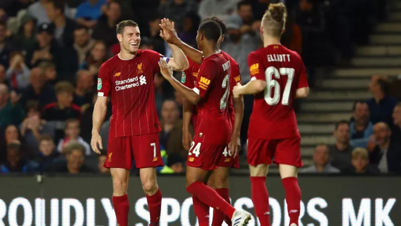 利物浦2-0战胜米尔顿凯恩斯的比赛中,老将米尔纳和16岁的小将埃利奥特联袂出场。
