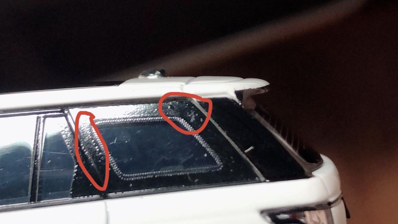 大家可以拿出自己手头的路虎看看,我也想求证一下是不是普遍问题,因为我这2台恰好都有了,玻璃不通透,玻璃窗边缘黑色部分,你仔细看这漆面不是很平整。