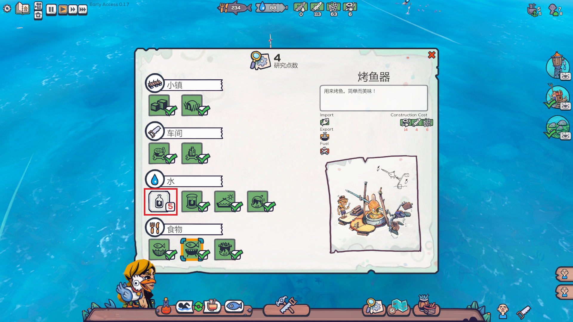 (0.1.17版本) 目前这游戏内容非常少,4小时左右就能玩完所有的内容并且衣食无忧和能研发完毕所有的科技(图1和图2),前期拿了研究点先解锁太阳能蒸馏器与储料场,另外收留幸存者最好选择拥有正面属性,如吃的少,移动很快,喝水很少或睡眠很少等等都会让游戏轻松很多。