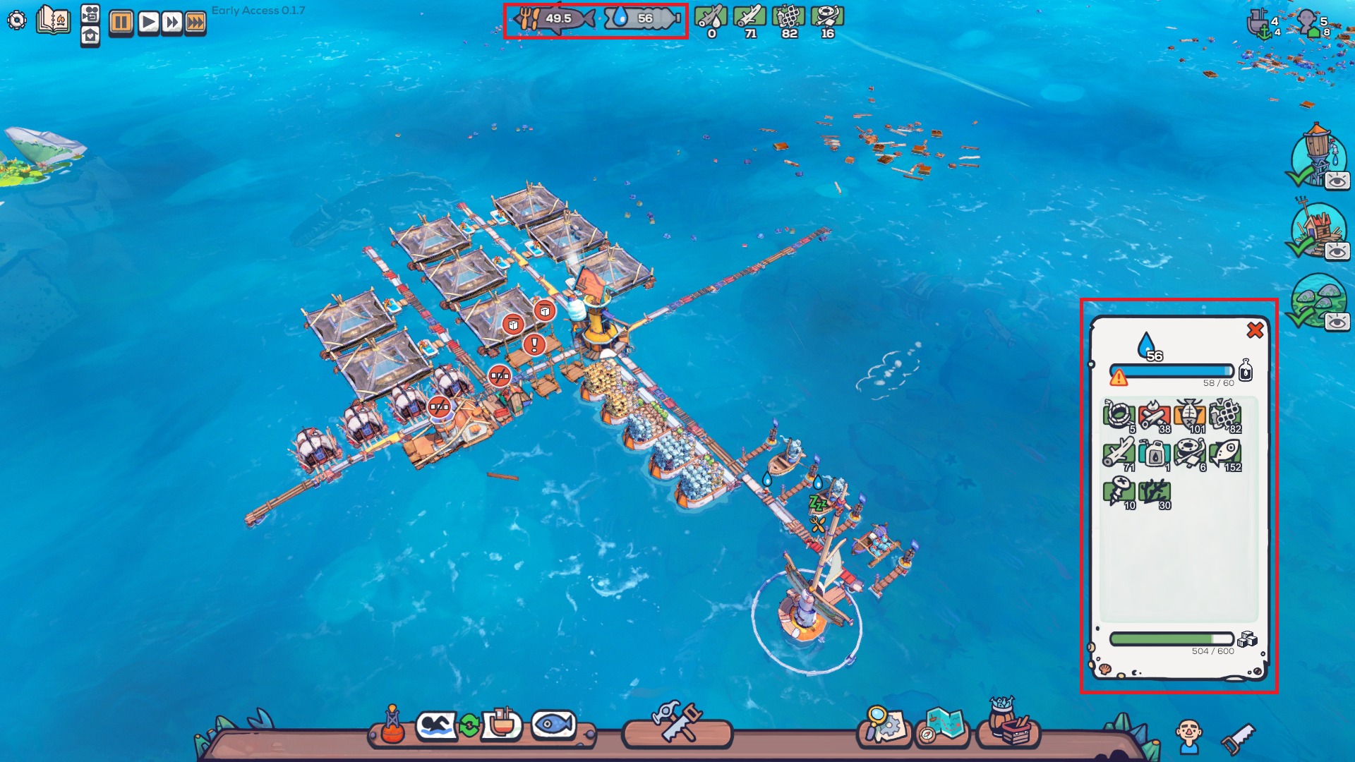 在前期第3个地图里(图1),解锁太阳能蒸馏器科技后,依照人数来建造太阳能蒸馏器数量,如要有水资源盈余可多建,2打捞船与2渔船加上6个太阳能蒸馏器在第3个地图里已经无任何的生存的压力了(图2),剩下就是慢慢解锁科技与规划建筑的快乐时光。。。。