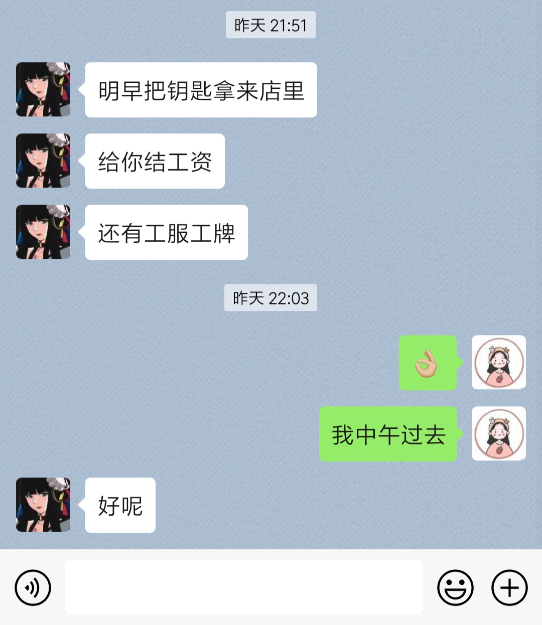 昨晚让我尽快送工服工牌钥匙过去。。工资都还没结给我呢着什么急啊。。趁我休息的时候找了一个大妈上岗 就把我踢走了。。牛逼死了