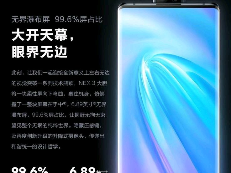 去实体店把玩了一会vivo nex3,突然有点不想换了还是继续用7p吧。 首先就是外观,确实是比较震撼,瀑布屏非常好看,但随后提现出来的还是6.89英寸使用的1080p A屏观感和屏幕素质方面还是不如7pro,感觉差的很远,然后就是打游戏时候却没有做好误触,因为曲面曲率太大,游戏顶部底部的很多设置,模式什么的很难点到,因为两边侧面屏是不能触控的,只有在边缘点,还难点到,这点非常难受。拍照方面比7pro稍好一丁点.,屏占比方面没有99.6那么夸张,下巴和额头还是能明显感觉到,但直观感受除了好看屏幕方面与7pro差距太大了,基本有想换vivo的加友暂时可以考虑不用换,除了好看还是好看,依旧没有无线充电,现在来说不建议换。