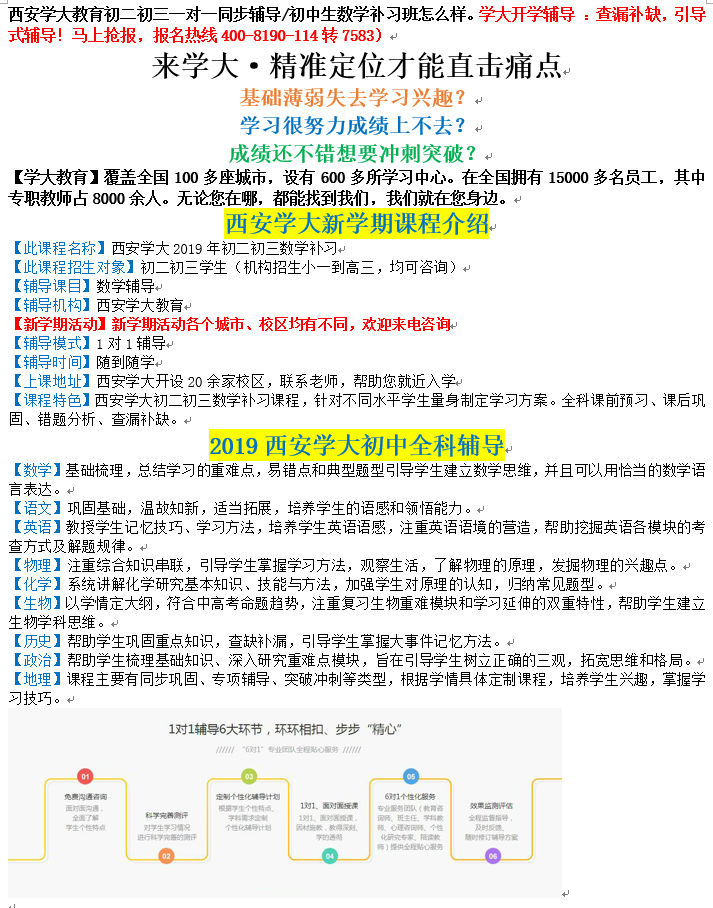 西安学大教育初二初三一对一同步辅导/初中生数学补习班怎么样为数学学习打下基础是非常重要的。数学知识是相互联系的,基础不牢固越往后学习,你就越难理解。数学概念学习是非常重要的。概念是基础。我们怎样才能灵活地运用它呢?初中生数学补习推荐西安学大教育,学大教育在授课环节上,多方监管,保障每节课的效率和质量;教学方法上,反复锤炼,精益求精。挺不错的跟大家推荐下。