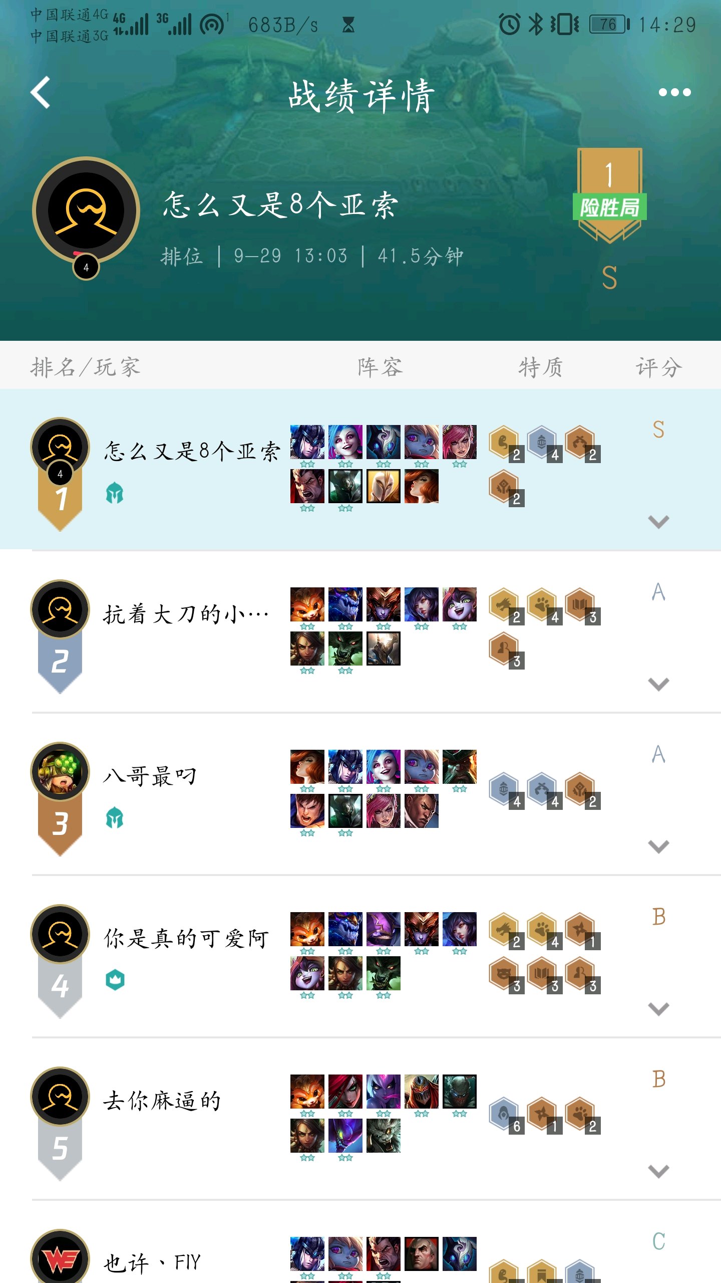 对,我很多第一都是险胜,就是决赛锁血用站位把对面打懵了