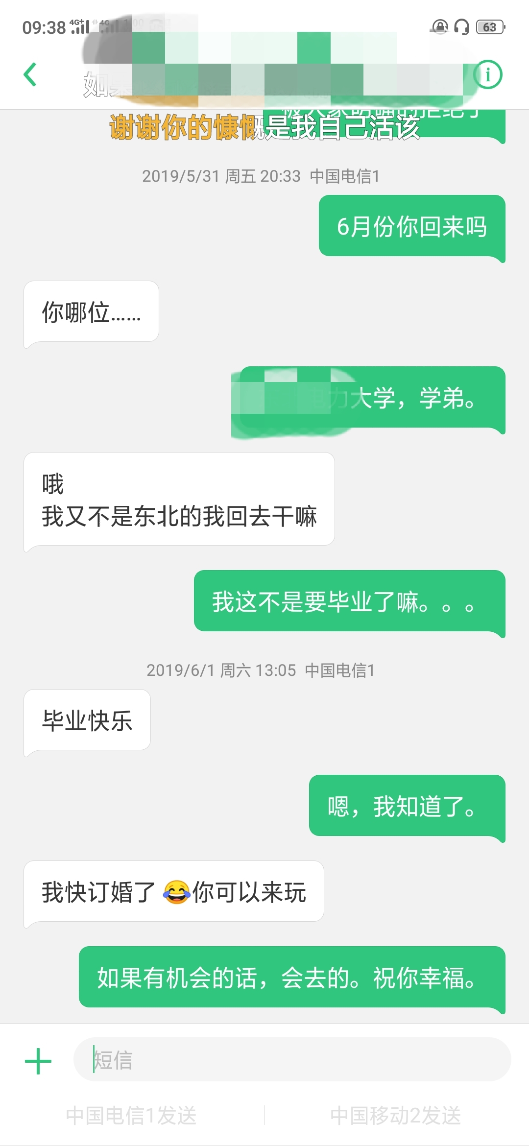 我在毕业的6月1号,问她会不会回学校,这句话也是因为她曾经说过会回来看我,上帝视角来看这句话就是骗人的,但我还是希望有一个万一吧。但是第二天她就告诉我说她要订婚了。晴天霹雳,哈哈。