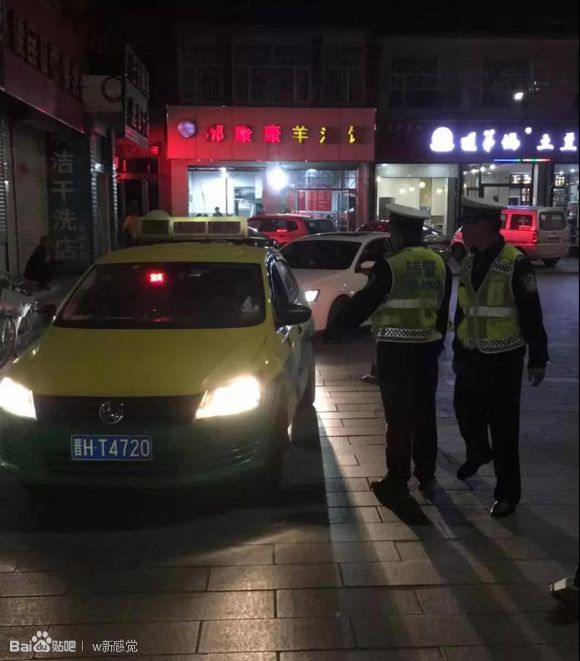夜晚的路灯下代县交警检查违章违法