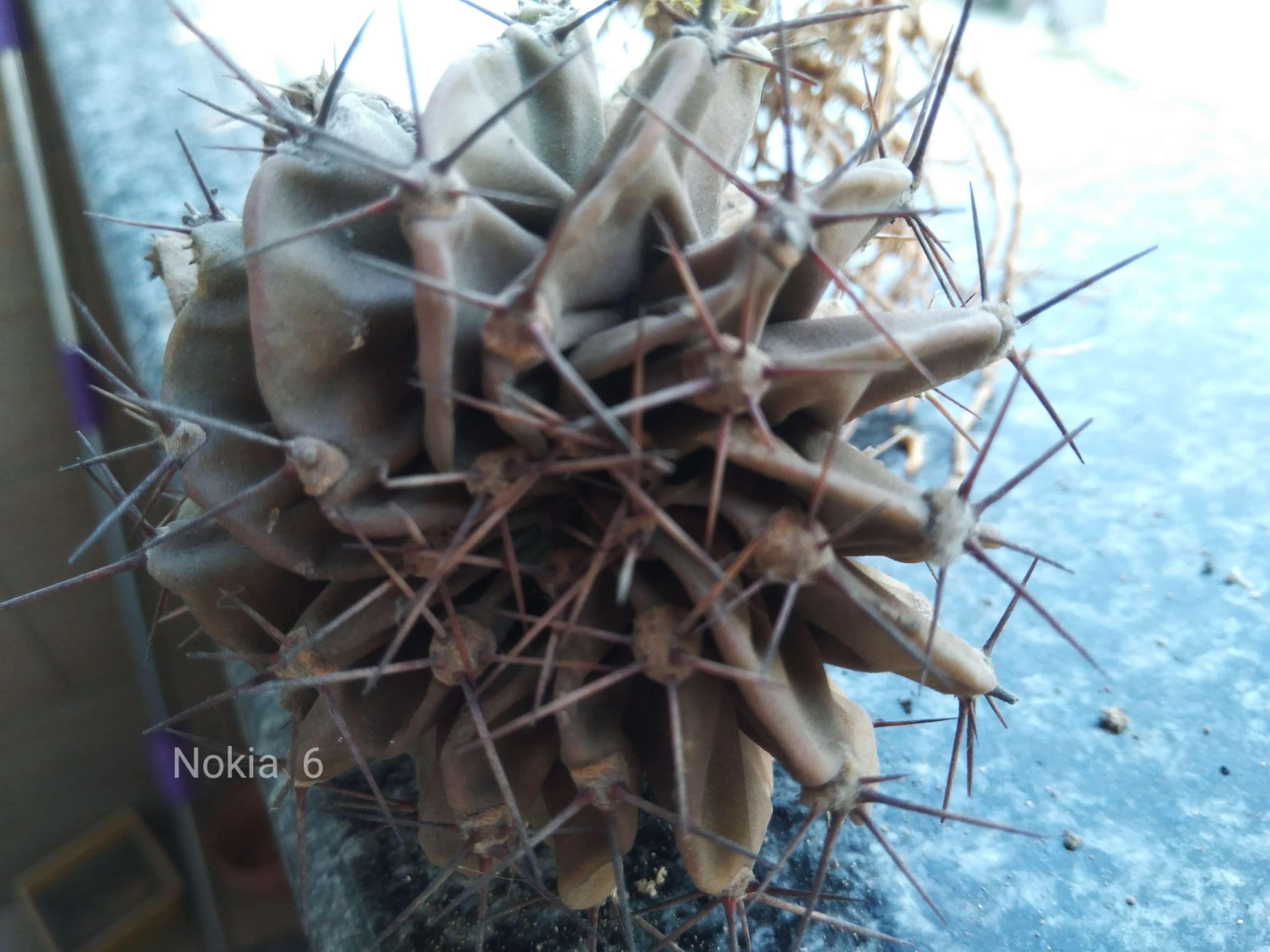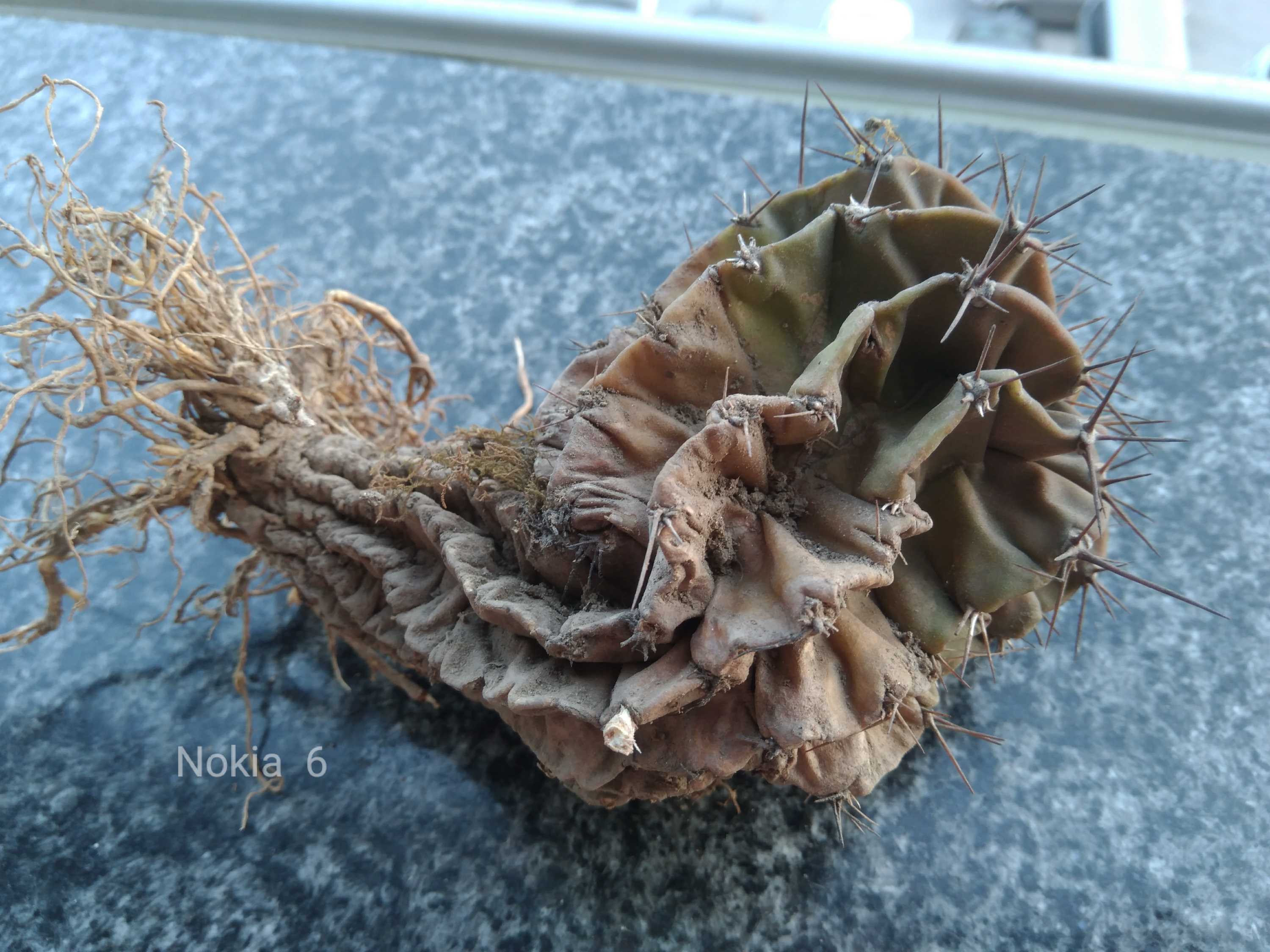 2018年十月突然心血来潮觉得不能亏待它,给它换换盘,摘了球上发出的小球。换了个陶土盆(以前是塑料盆),根须也修掉了,没下肥,土就随便河边挖了点带沙的土,换盘后也没浇水。几个月后就发现不对了,以前啥都不管它都是绿油油的,现在变黄了瓣瓣也萎缩变形了,因为人在外地工作也没及时处理,趁现在国庆放假几天把它重新挖了出来,现在都不是圆球了,有铁锈色,我想问问高手,这球还有救吗??如何救?谢谢