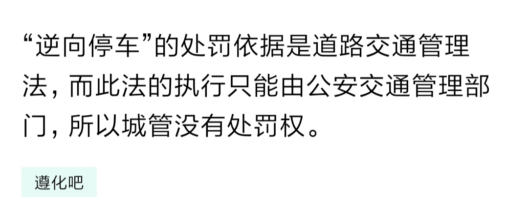“逆向停车”的处罚依据是道路交通管理法,而此法的执行只能由公安交通管理部门,所以城管没有处罚权。