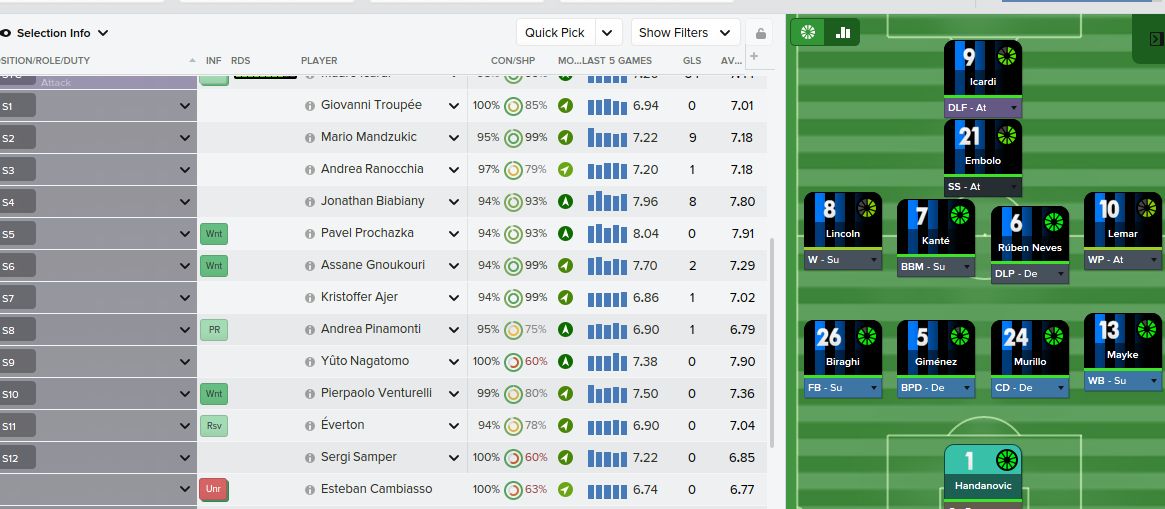 我自己的思路是,对手只有2个中场而且后腰没人,我在AMC放一个。还有就是尝试过把边路都调成WM然后在个人设置里选择多内切,也是想利用这个空间,但是没有效果。
