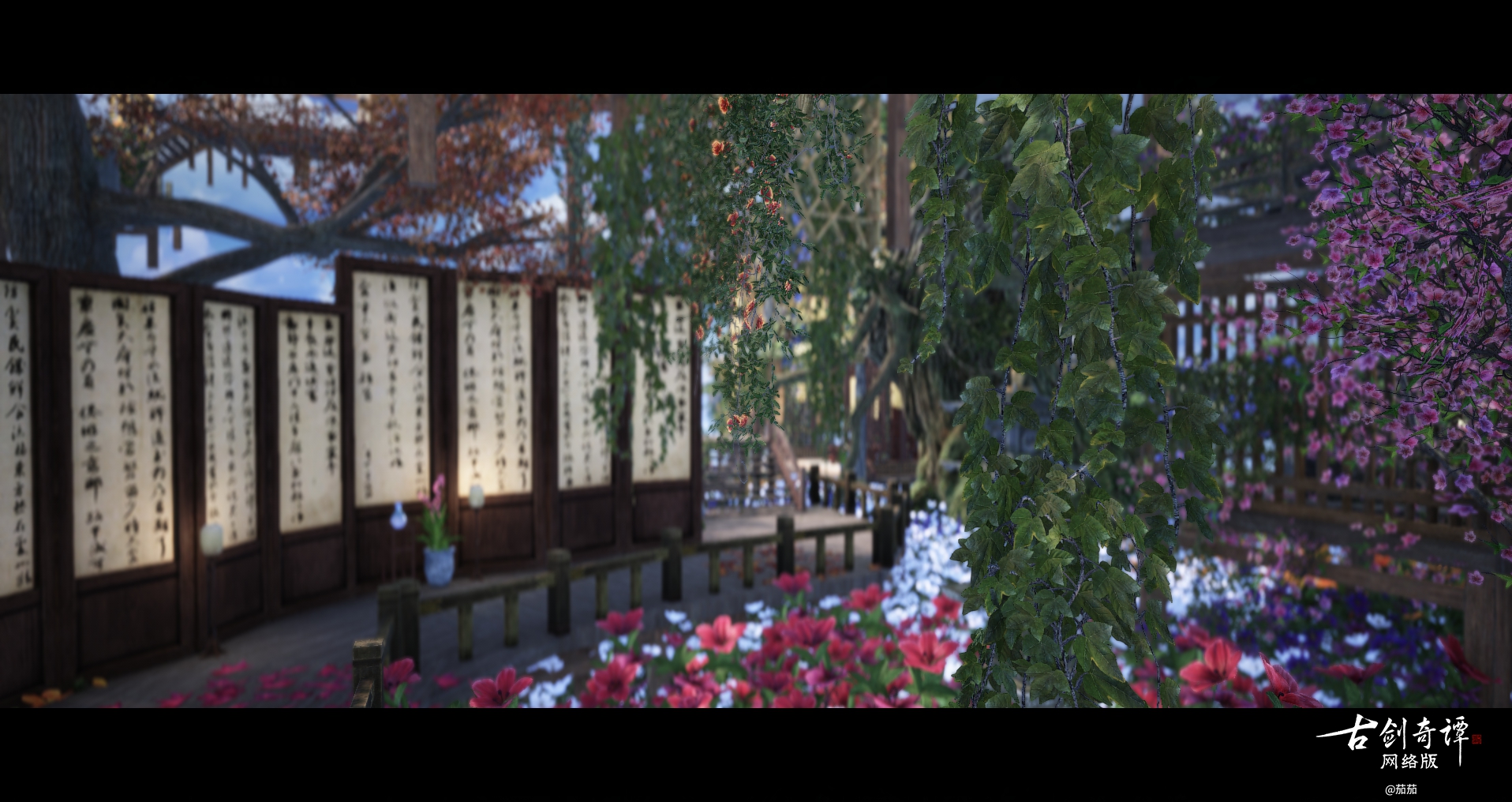 路的尽头是屏风长廊~地上的落叶太贵了所以只稀稀疏疏贴了三块(再次流下贫穷的泪水)