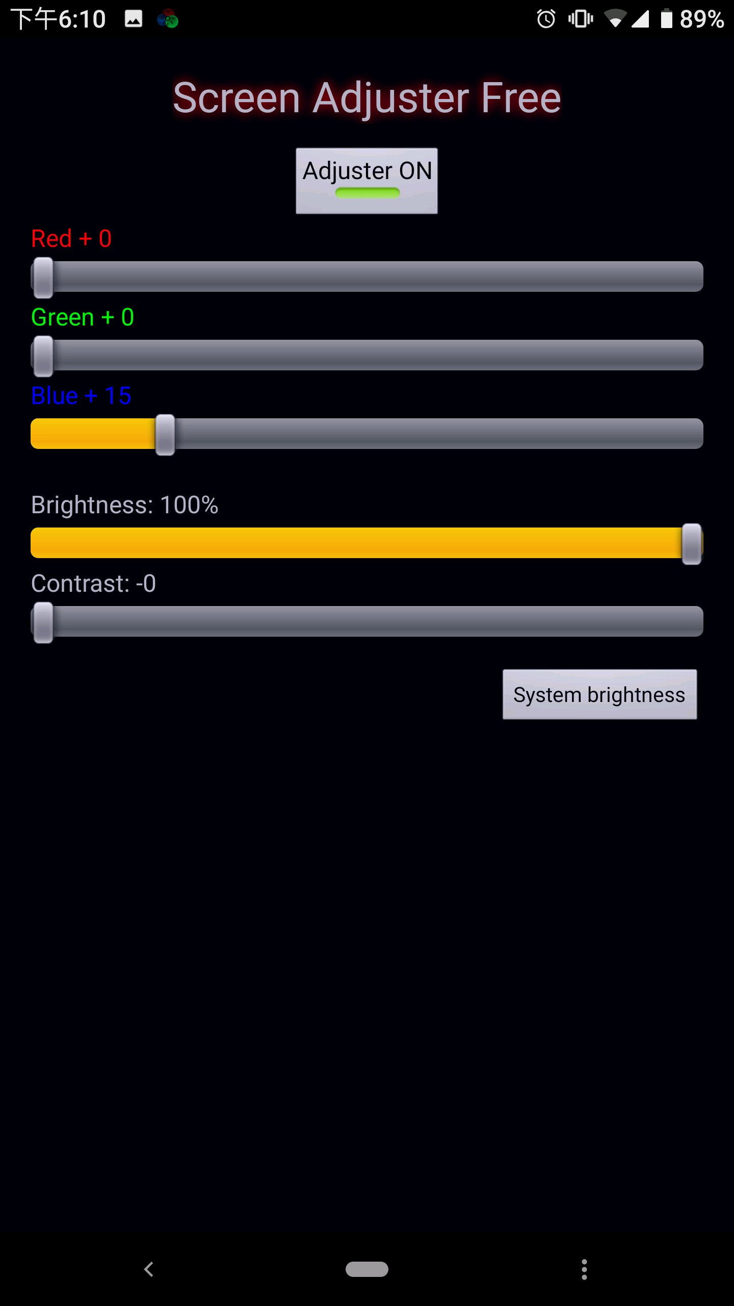 屏幕黄的朋友福音来了,哈哈。一直觉得雷蛇2的屏幕黄,今天百度了一下,下载此软件。安装,会提示软件版本低,不用理会。点上上边按钮adjuster off 点开是on 增加蓝色就行,怎么好看自己调。还有就是下拉菜单的提示关闭不要点,点了效果就关闭了。请叫我雷锋哈